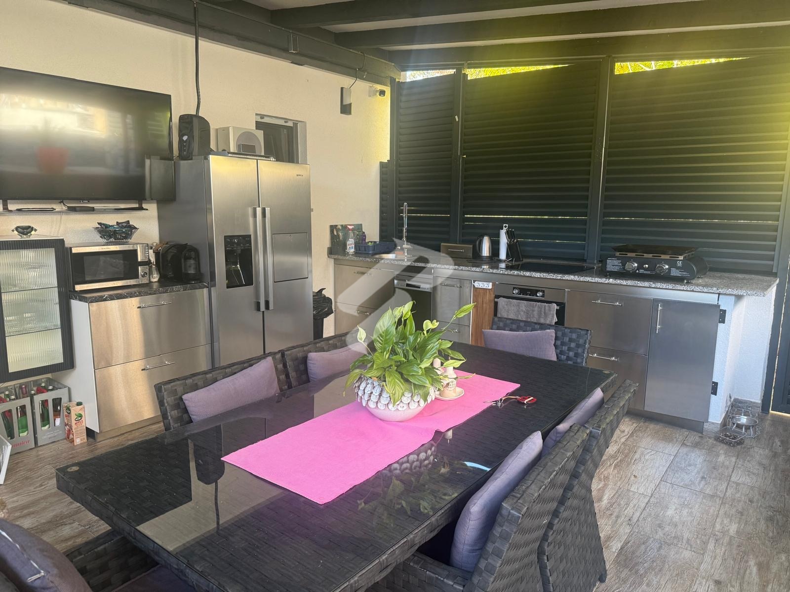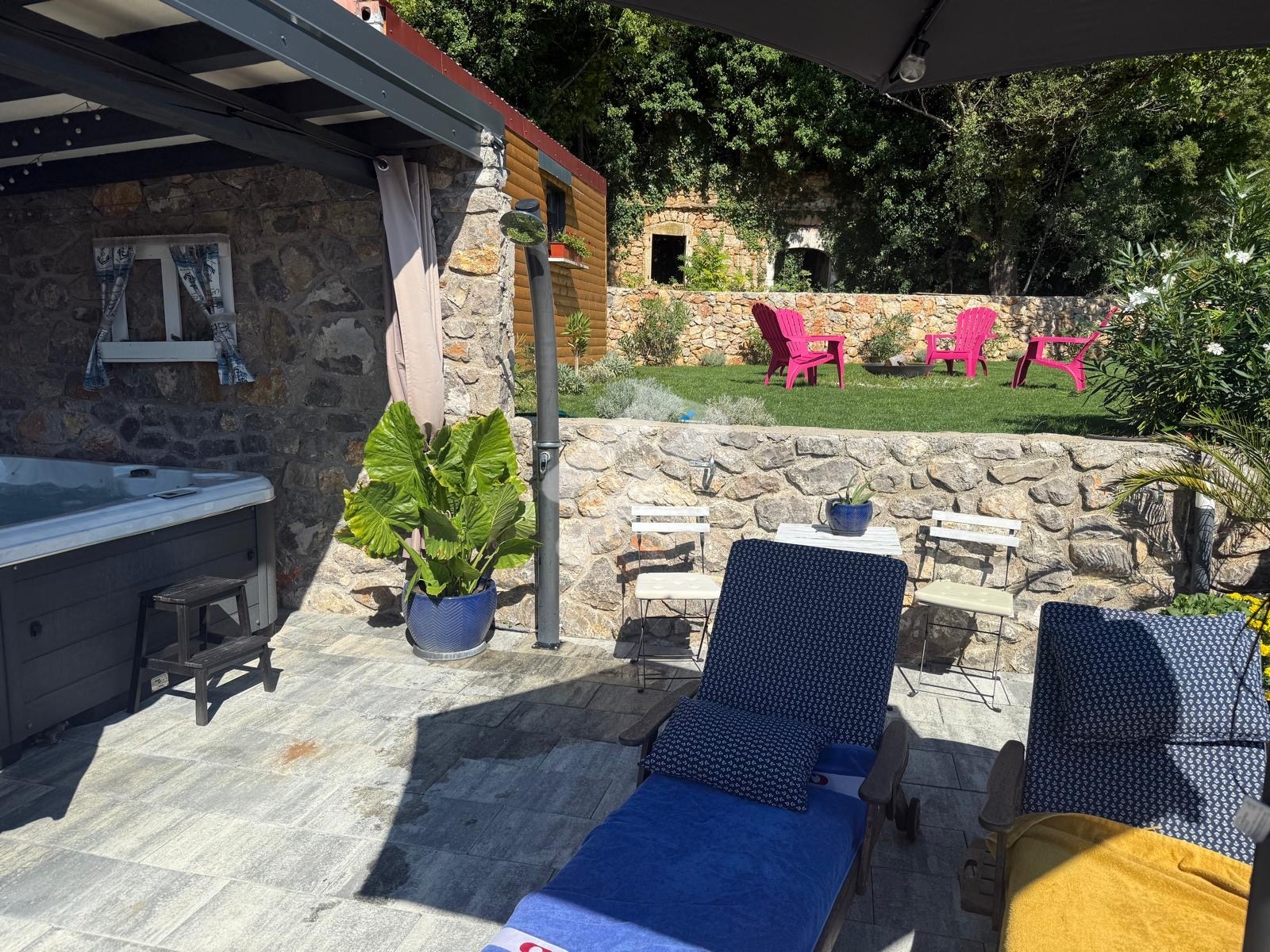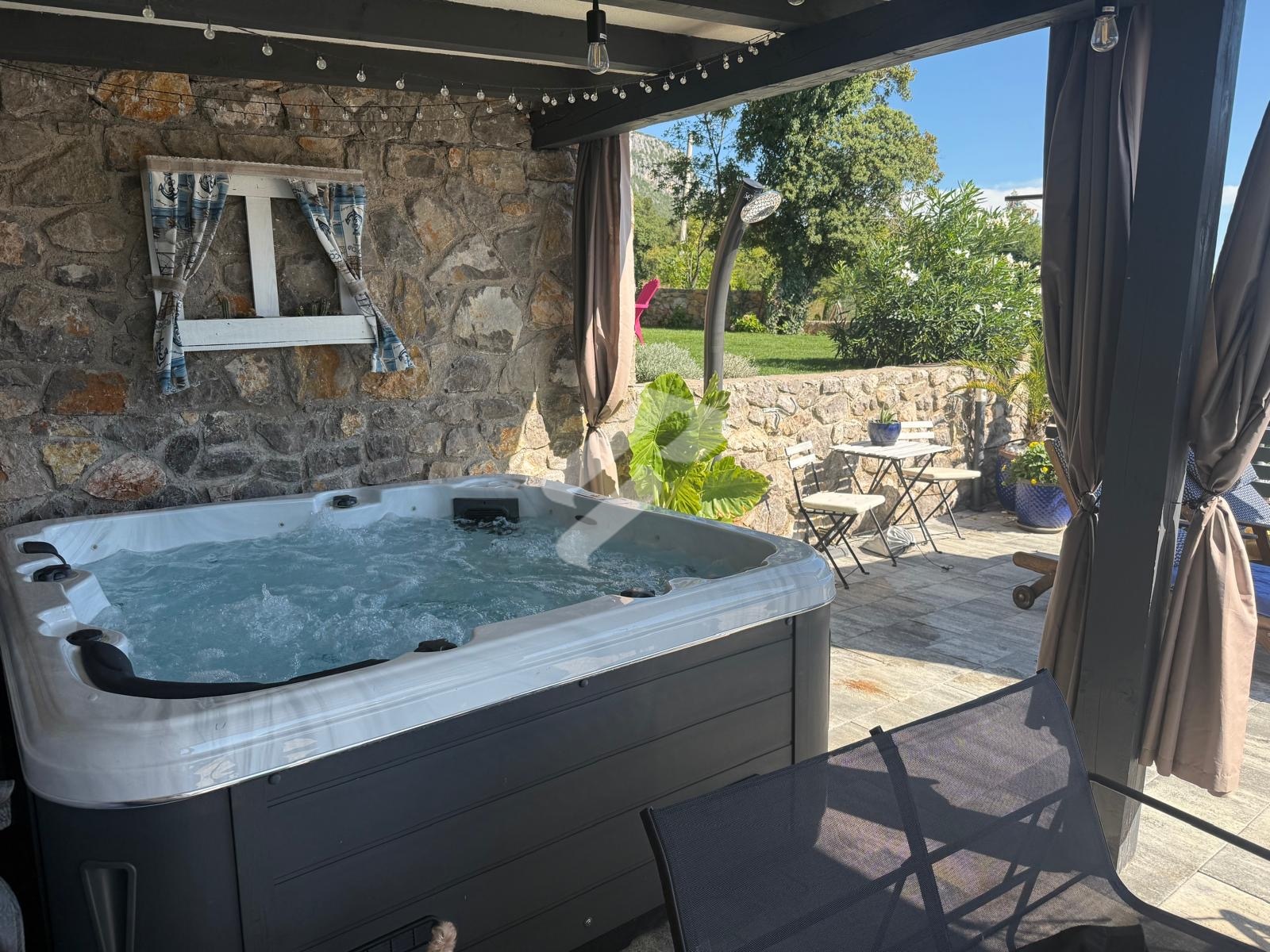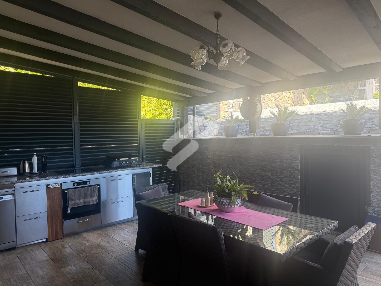 Der besondere Wert dieser Immobilie liegt im Außenbereich, der ein vollständiges mediterranes Lebensgefühl bietet. Die Terrasse mit Pool, Jacuzzi und Sommerküche unter einer überdachten Pergola schafft den perfekten Ort zum Entspannen und für gesellige Zusammenkünfte. Die Umgebung ist ruhig, von viel Grün und Natur geprägt, und der Meerblick verleiht dem gesamten Anwesen zusätzlichen Charme. Zudem verfügt das Haus über eine Dachterrasse, ideal zum Sonnen und zum Genießen wunderschöner Sonnenuntergänge.
