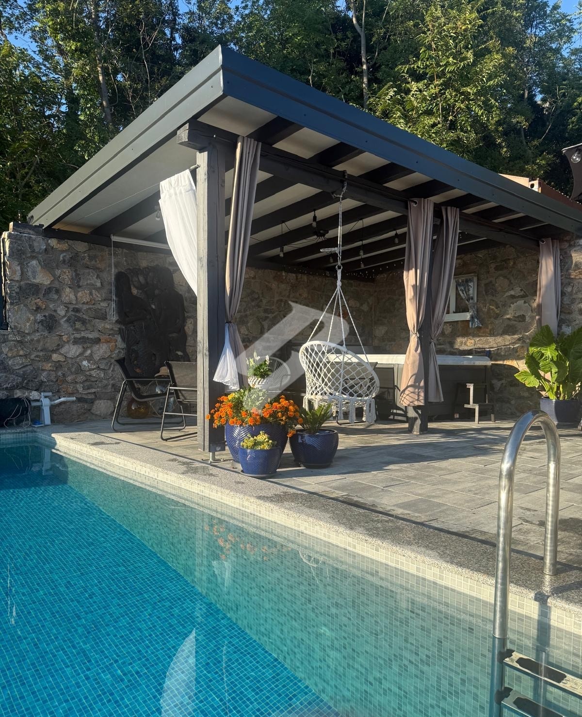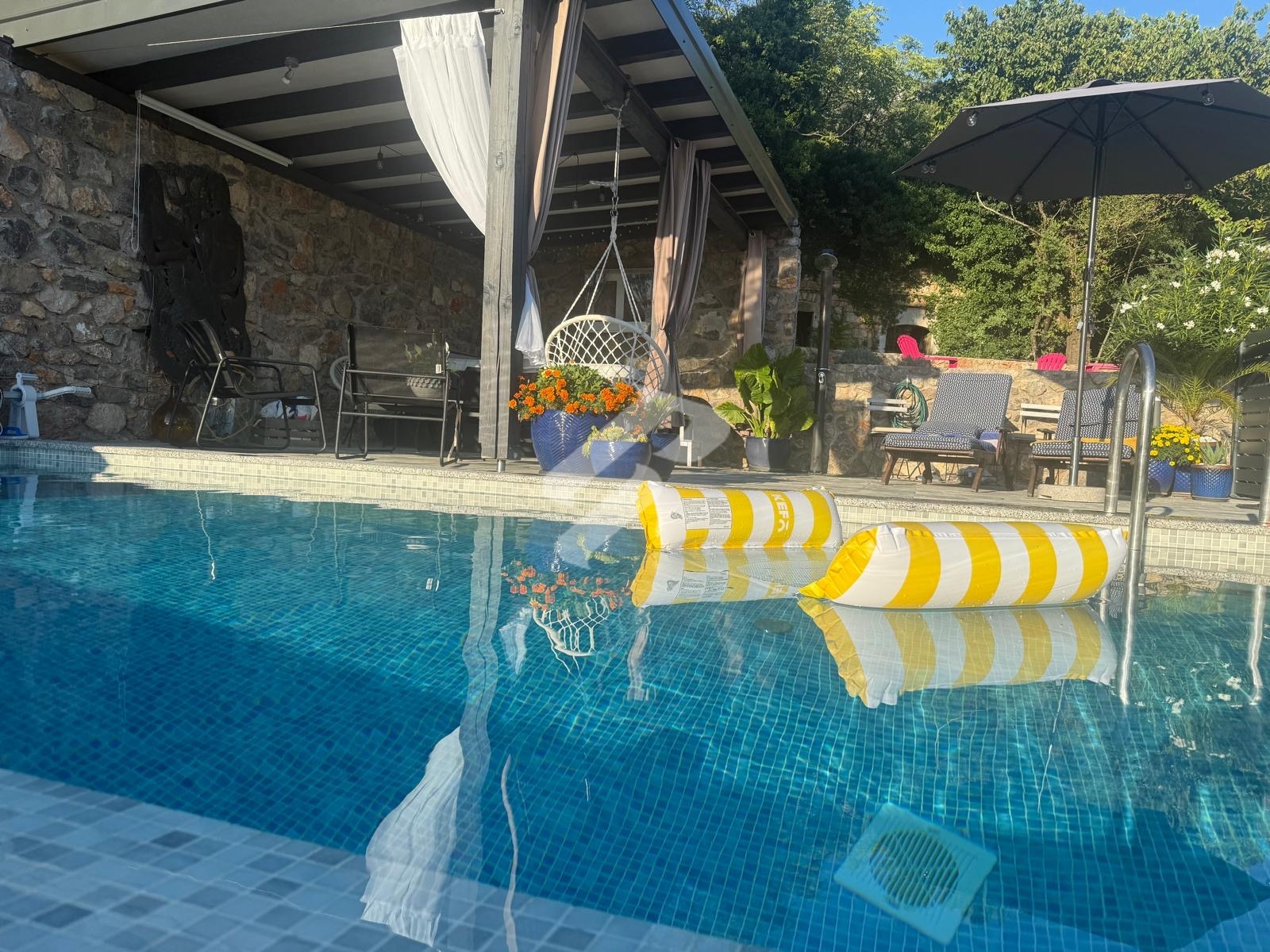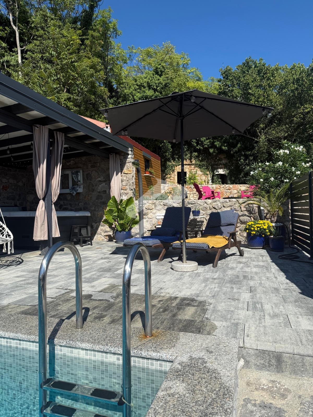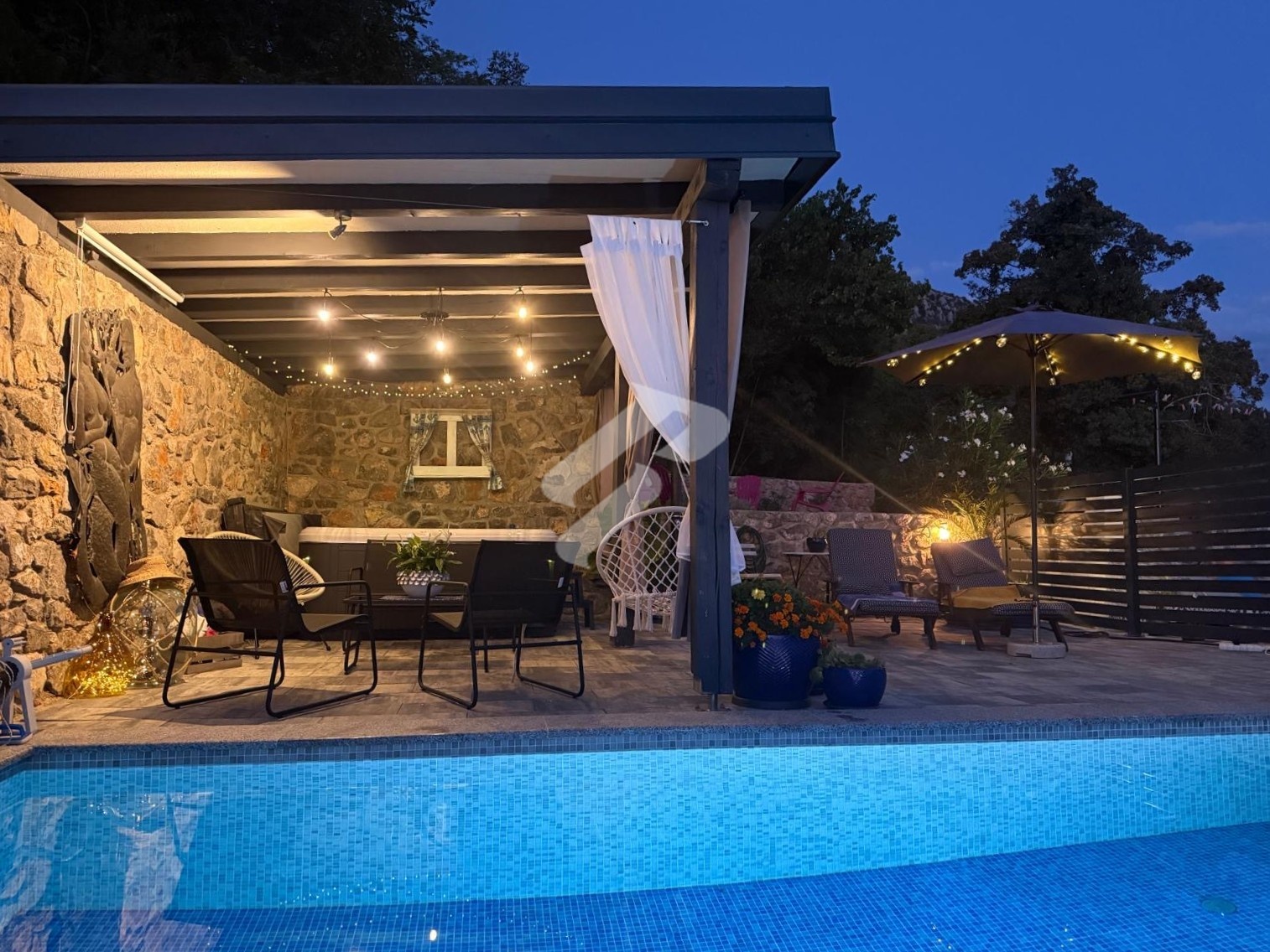 Der besondere Wert dieser Immobilie liegt im Außenbereich, der ein vollständiges mediterranes Lebensgefühl bietet. Die Terrasse mit Pool, Jacuzzi und Sommerküche unter einer überdachten Pergola schafft den perfekten Ort zum Entspannen und für gesellige Zusammenkünfte. Die Umgebung ist ruhig, von viel Grün und Natur geprägt, und der Meerblick verleiht dem gesamten Anwesen zusätzlichen Charme. Zudem verfügt das Haus über eine Dachterrasse, ideal zum Sonnen und zum Genießen wunderschöner Sonnenuntergänge.