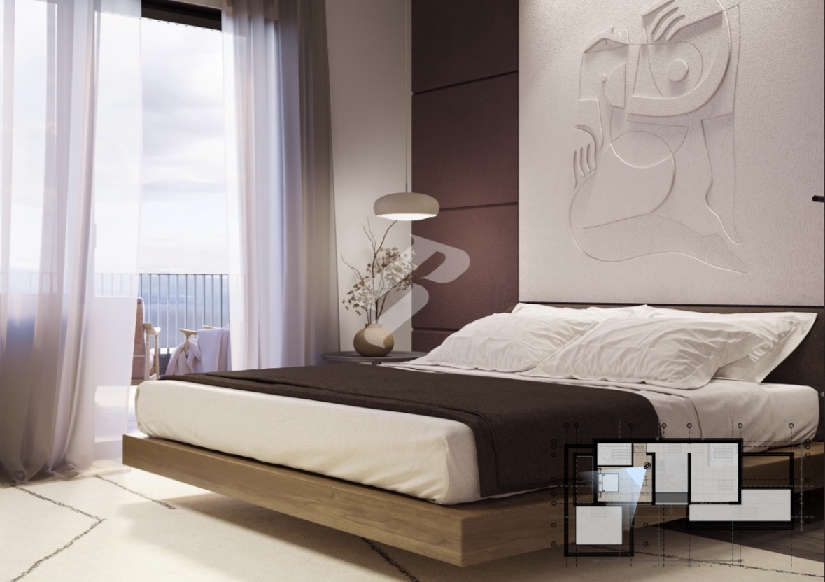 Die mittlere Etage bildet das Herz des Hauses mit einem großzügigen Wohnzimmer, das mit einer modernen Küche und einem Essbereich verbunden ist. Der Wohnbereich wird durch eine Galerie ergänzt, die ein luftiges und exklusives Raumgefühl sowie einen wunderschönen offenen Meerblick bietet. Auf dieser Ebene befinden sich zudem ein Gäste-WC sowie ein weiteres Schlafzimmer mit eigenem Bad, ideal für Familie oder Gäste.
