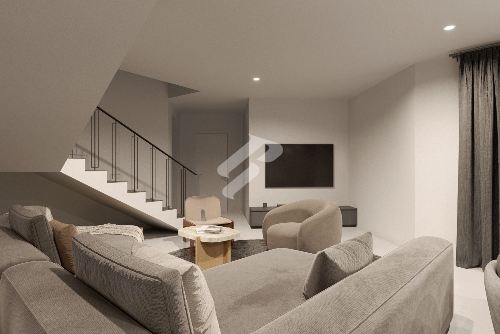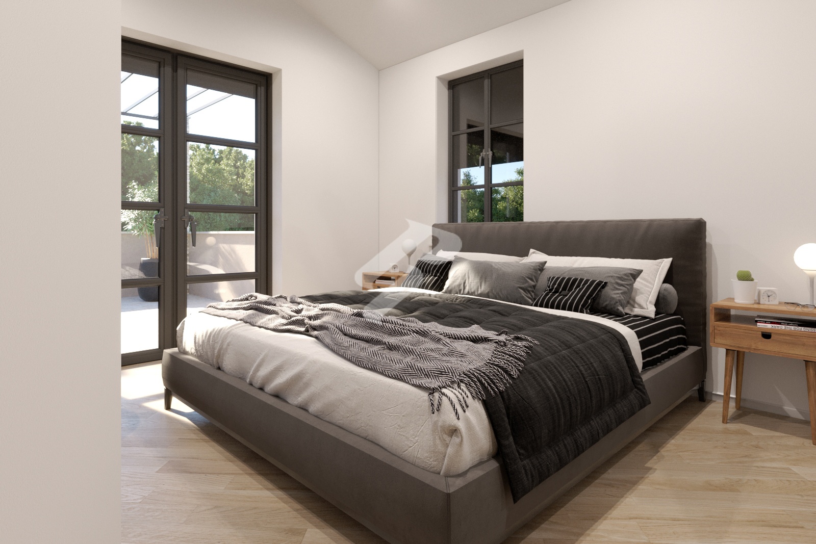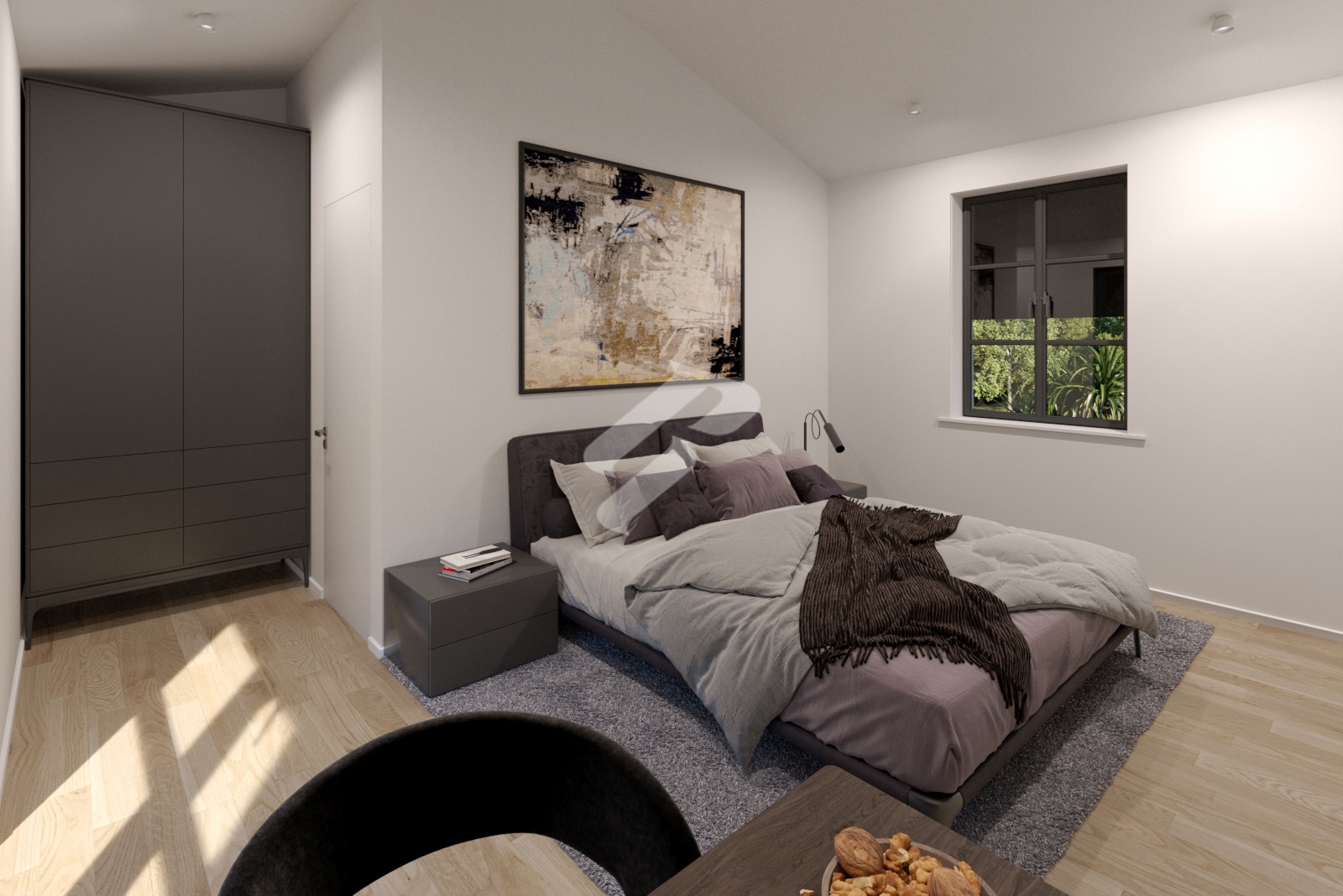 Über eine Innentreppe vom Wohnbereich gelangt man in das Obergeschoss, wo sich zwei weitere Schlafzimmer befinden. Jedes Zimmer verfügt über ein eigenes Bad und eine Terrasse, was zukünftigen Eigentümern maximalen Komfort und Privatsphäre bietet.