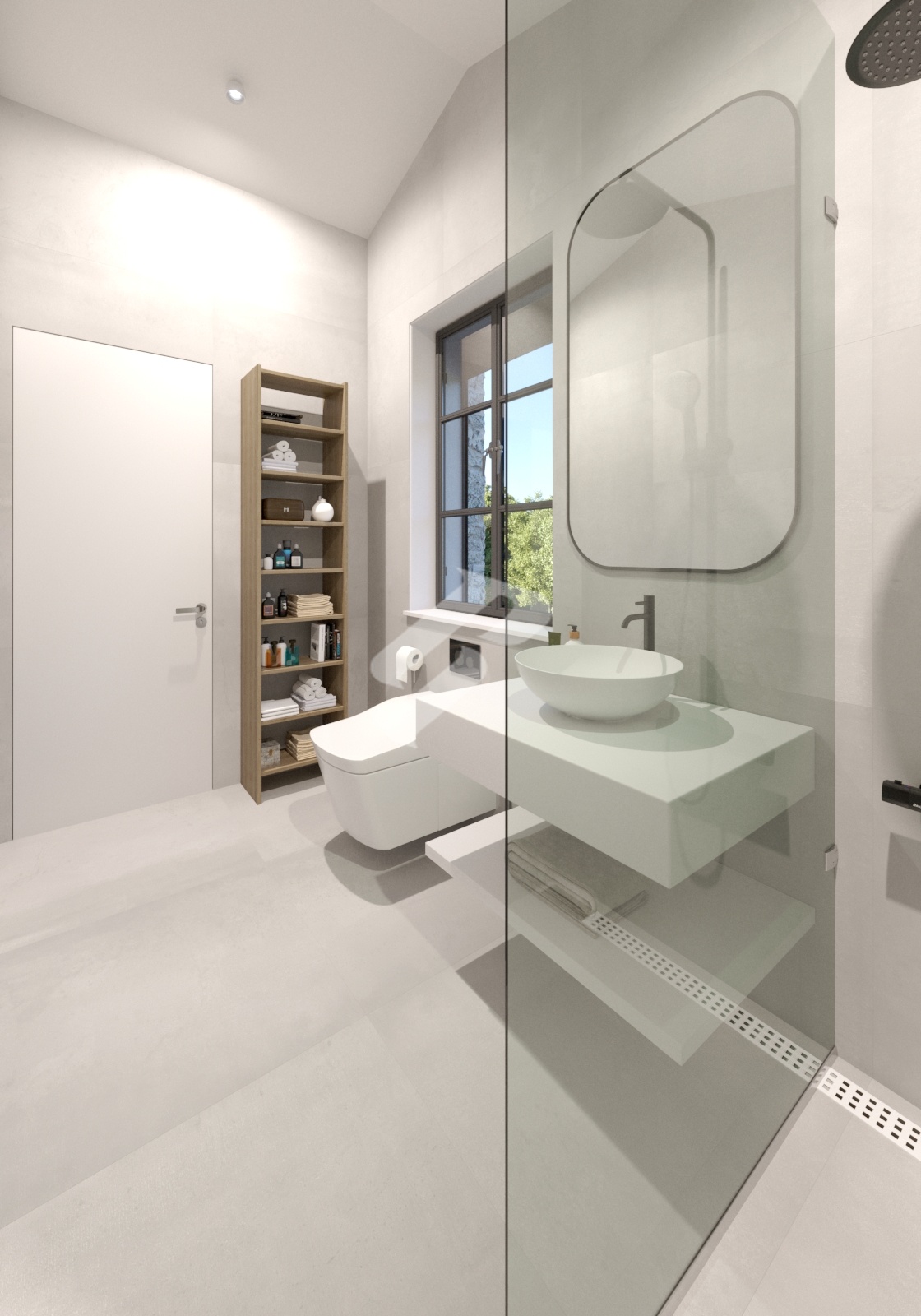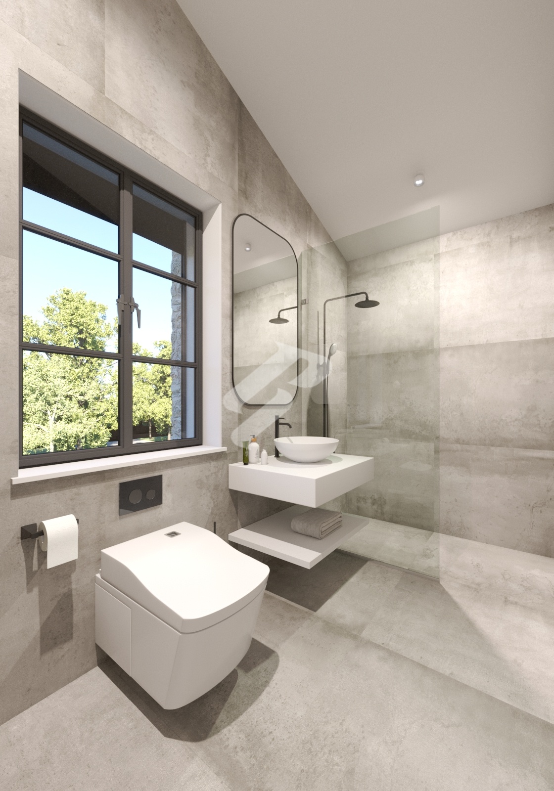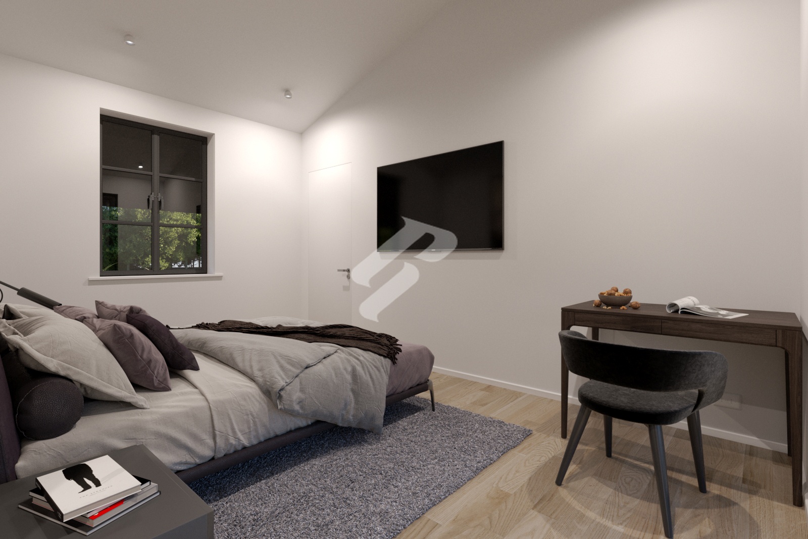 Über eine Innentreppe vom Wohnbereich gelangt man in das Obergeschoss, wo sich zwei weitere Schlafzimmer befinden. Jedes Zimmer verfügt über ein eigenes Bad und eine Terrasse, was zukünftigen Eigentümern maximalen Komfort und Privatsphäre bietet.