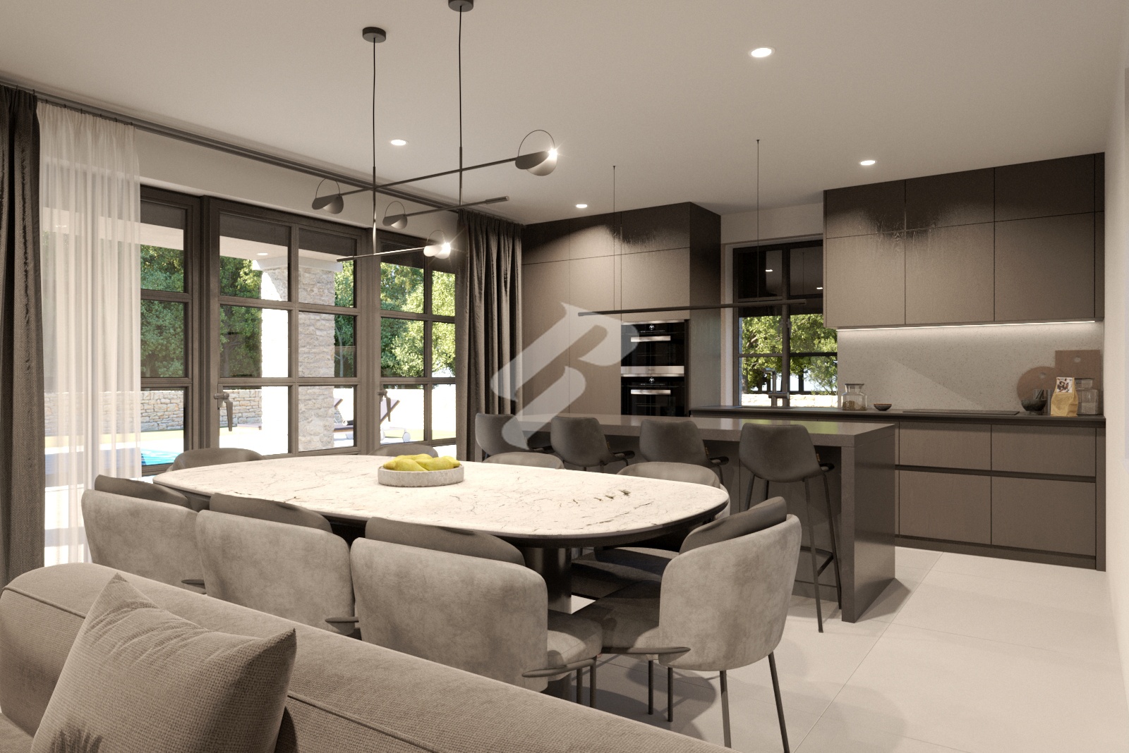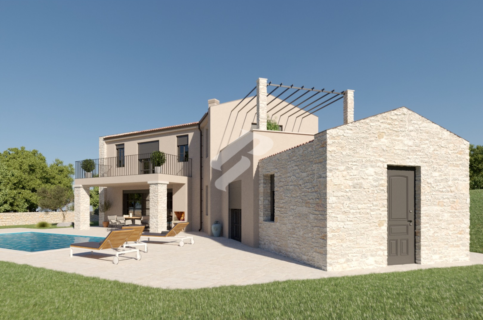 In einer ruhigen Gegend in der Nähe von Poreč befindet sich ein im Bau befindliches Haus, das mediterranen Charme mit modernem Charakter verbindet. Die Kombination aus Stein und Fassade verleiht ihm ein elegantes, zugleich warmes und natürliches Erscheinungsbild.