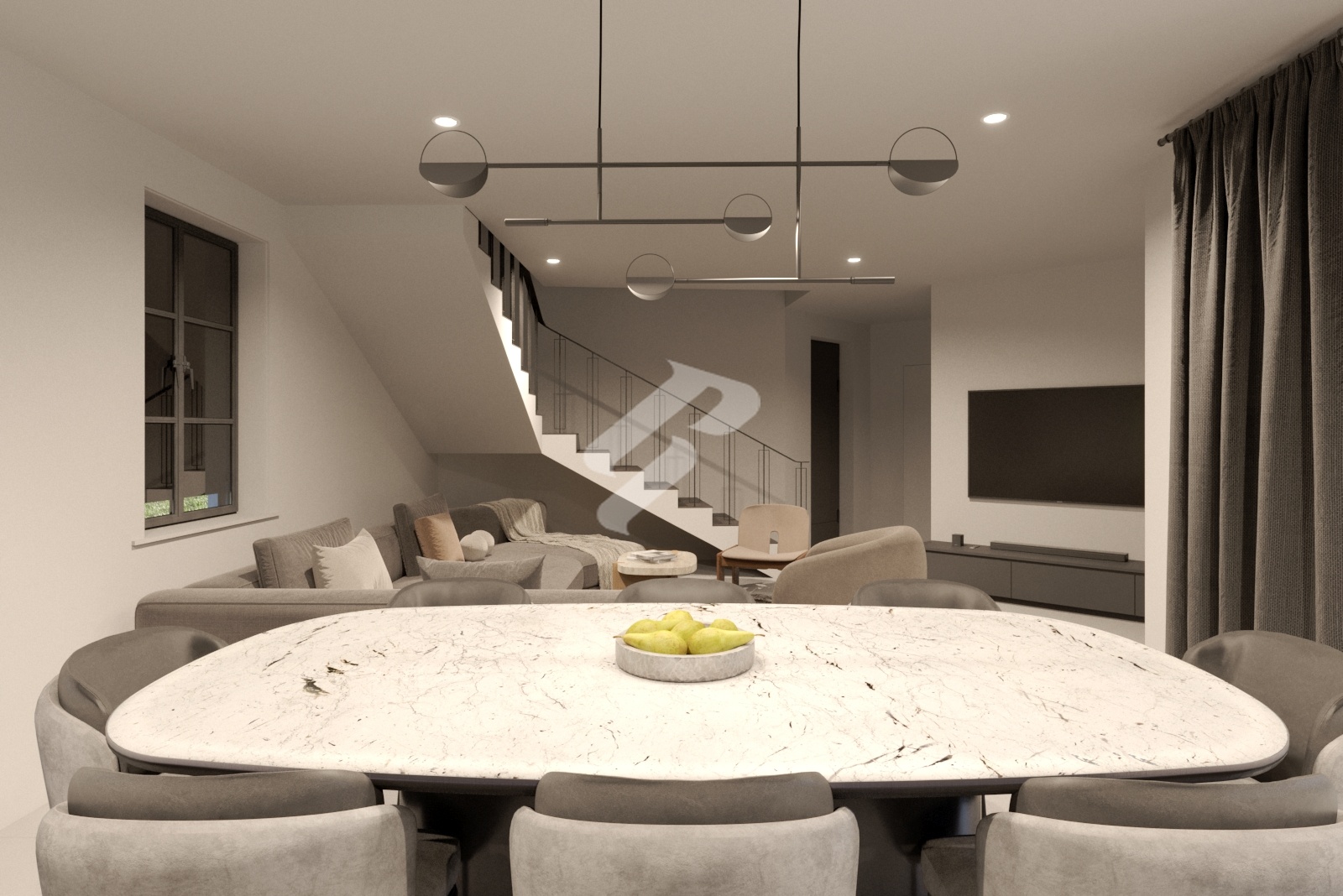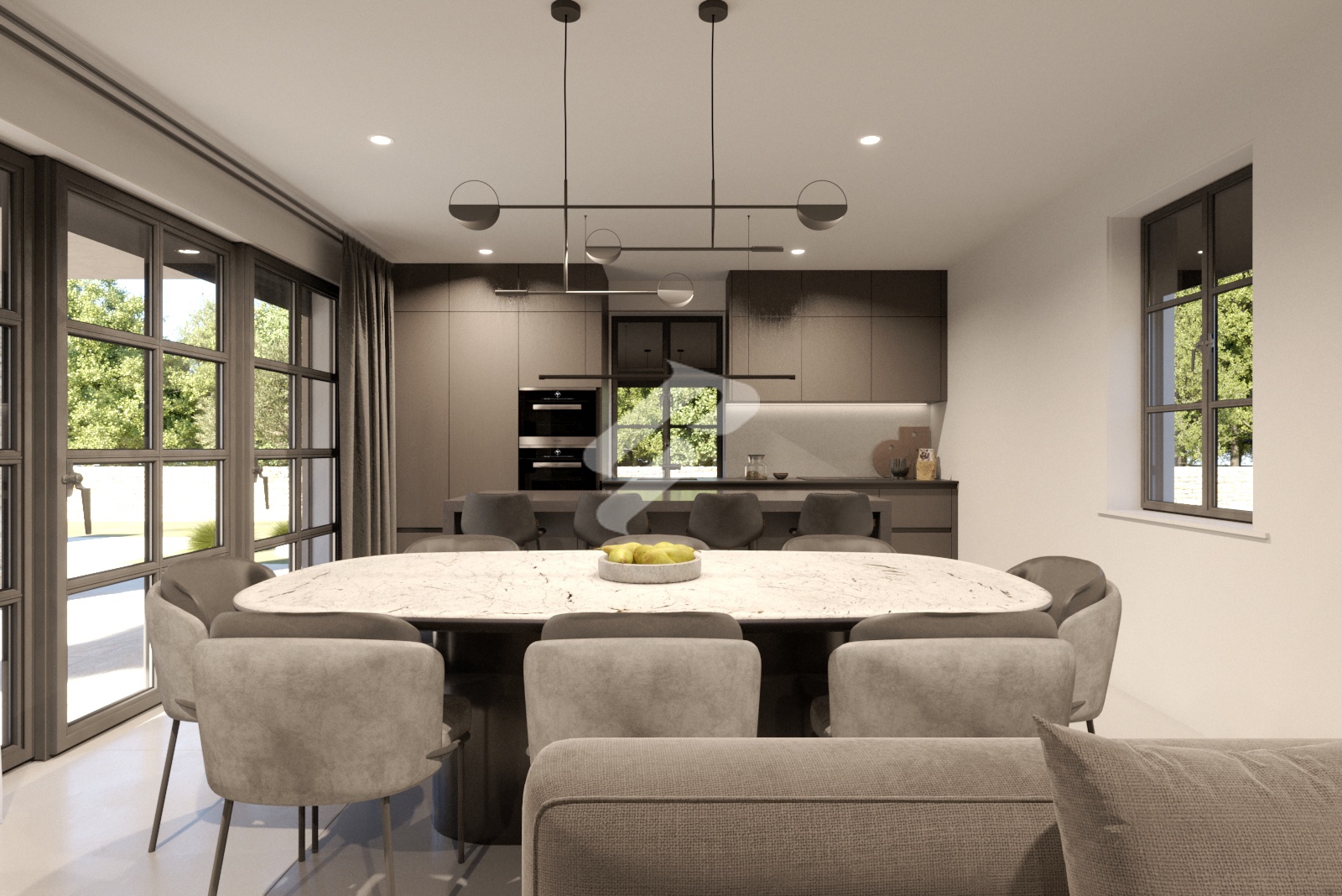 Die Immobilie liegt auf einem großzügigen Grundstück von 778 m², die Gesamtwohnfläche beträgt 172,25 m². Das Erdgeschoss ist als großer offener Raum konzipiert, der Küche, Ess- und Wohnbereich kombiniert und ein luftiges, verbundenes Raumgefühl schafft. Von der Küche aus hat man Blick auf den Pool, was zur angenehmen Atmosphäre beiträgt. Außerdem gibt es im Erdgeschoss ein Gästebad und ein Schlafzimmer mit eigenem Bad und Zugang zur Terrasse.