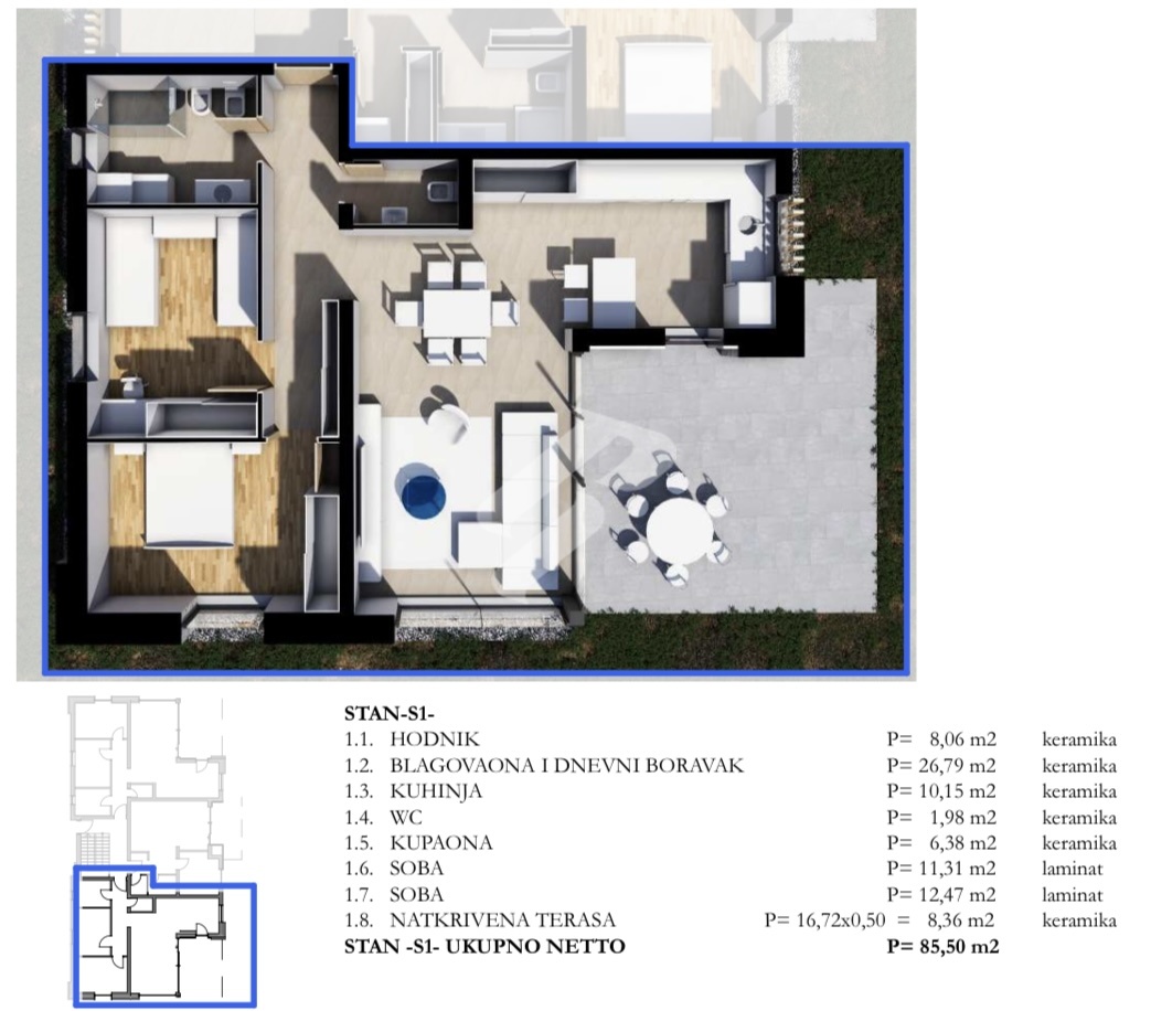 Die Wohnung S1-2 mit einer Gesamtfläche von 85,50 m² befindet sich im Erdgeschoss und besteht aus einem Eingangsbereich, zwei Schlafzimmern, einem Badezimmer sowie einem zusätzlichen WC. Der zentrale Teil der Wohnung bildet ein moderner offener Wohnbereich, der Küche, Essbereich und Wohnzimmer miteinander verbindet. Vom Wohnzimmer und von der Küche gelangt man auf die Terrasse, während große panoramische Glasflächen viel natürliches Licht hereinlassen und eine angenehme und warme Atmosphäre im Raum schaffen.