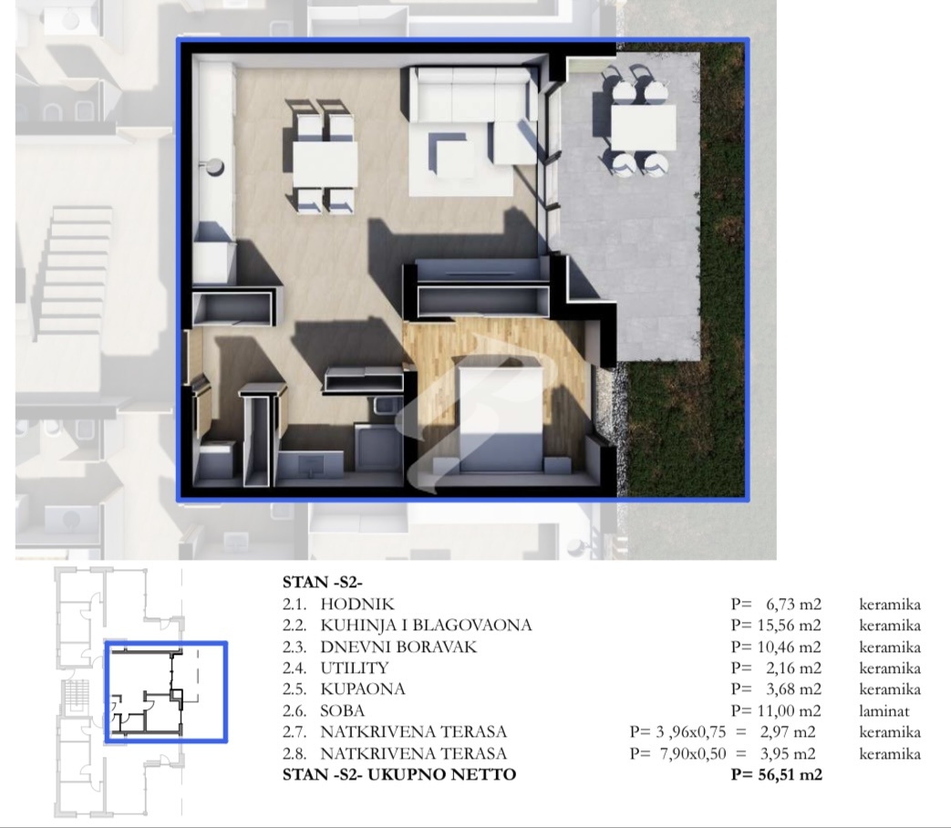 Die Wohnung S2-2 mit einer Gesamtfläche von 56,51 m² befindet sich im Erdgeschoss und besteht aus einem Eingangsbereich, einem Schlafzimmer, einem Badezimmer sowie einem separaten Raum, der als Waschküche vorgesehen ist. Der zentrale Teil der Wohnung bildet ein moderner offener Wohnbereich, der Küche, Essbereich und Wohnzimmer miteinander verbindet. Vom Wohnzimmer und von der Küche gelangt man auf die Terrasse, während große Glasflächen viel natürliches Licht hereinlassen und eine angenehme und warme Atmosphäre im Raum schaffen.