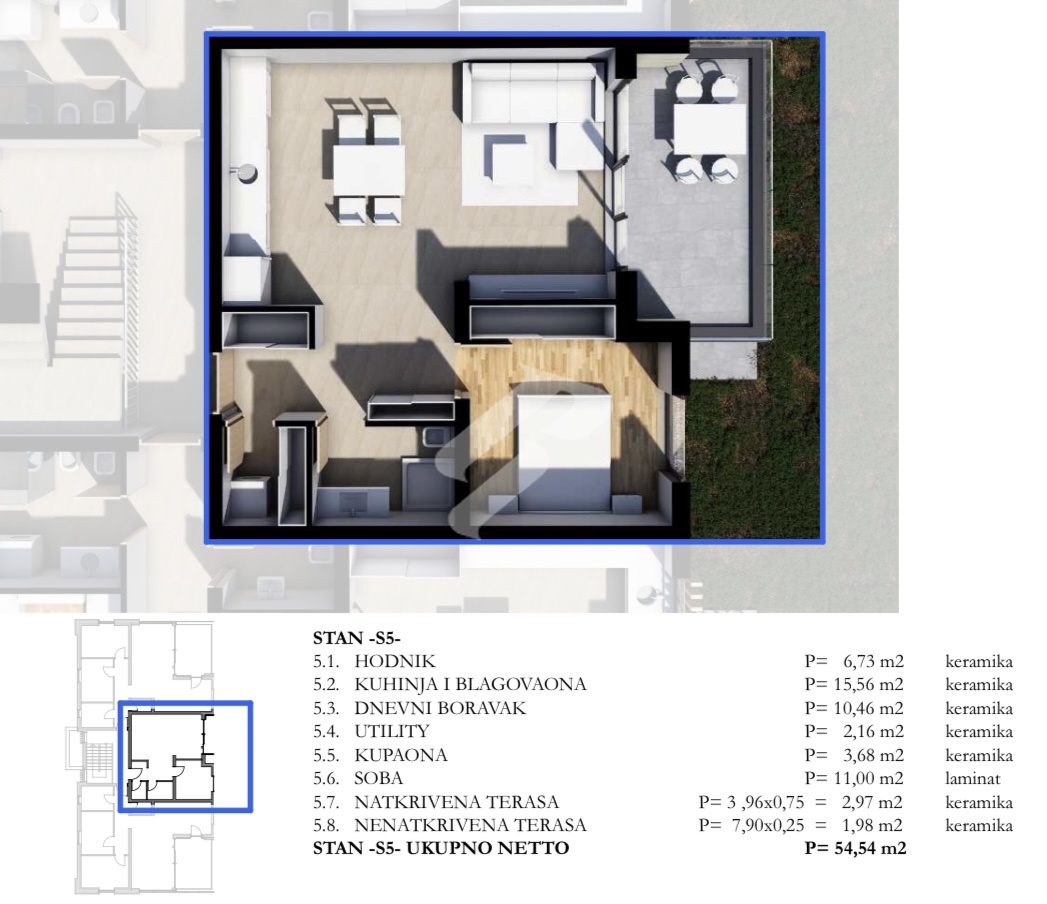 Die Wohnung S5-2 mit einer Gesamtfläche von 54,54 m² befindet sich im ersten Stock und besteht aus einem Eingangsbereich, einem Schlafzimmer, einem Badezimmer sowie einem separaten Raum, der als Waschküche vorgesehen ist. Der zentrale Teil der Wohnung bildet ein moderner offener Wohnbereich, der Küche, Essbereich und Wohnzimmer miteinander verbindet. Vom Wohnzimmer und von der Küche gelangt man auf die Terrasse, während große Glasflächen viel natürliches Licht hereinlassen und eine angenehme und warme Atmosphäre im Raum schaffen.