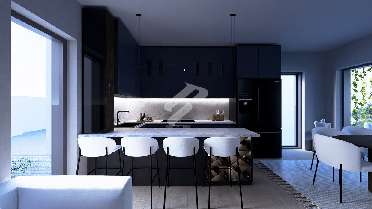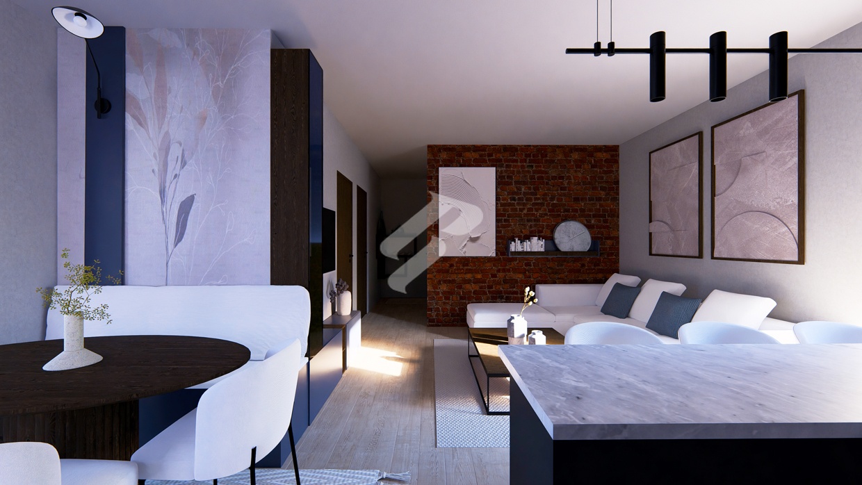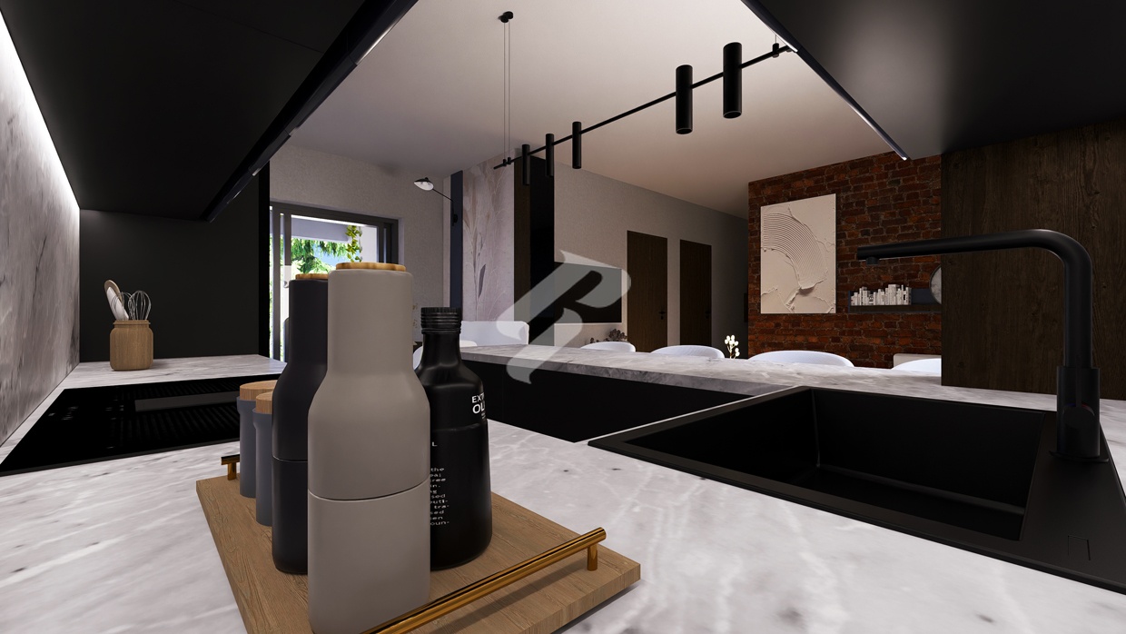 Der großzügige offene Wohnbereich, kombiniert mit Küche und Essbereich, schafft einen modernen und hellen Raum, perfekt zum Entspannen und für geselliges Beisammensein. Große Glasfronten füllen den Raum mit natürlichem Licht und führen zum überdachten Balkon, ideal für Morgenkaffee, ein leichtes Mittagessen oder entspannte Abende.