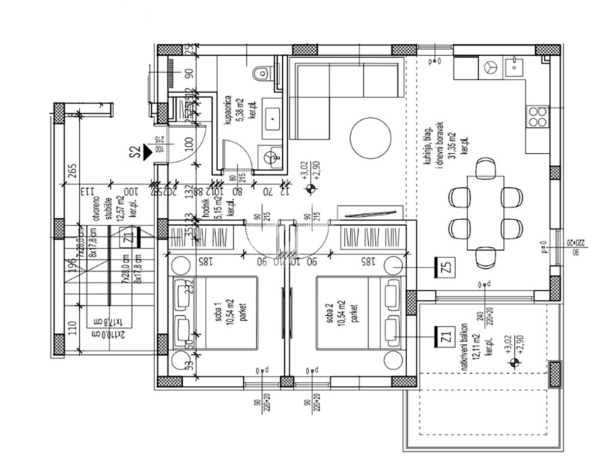 Die Wohnung S2 befindet sich im ersten Stock, im nordwestlichen Teil eines modernen Gebäudes in der ruhigen und begehrten Gegend von Petrčani, in der Nähe von Zadar. Sie ist für Komfort und modernes Wohnen konzipiert, mit Fokus auf Helligkeit, Funktionalität und hochwertigen Materialien.