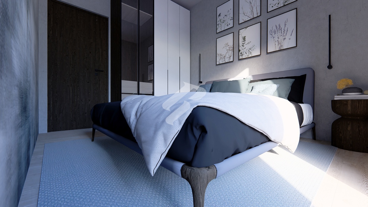 Zwei komfortable Schlafzimmer bieten ausreichend Platz für Doppelbetten, wobei maßgefertigte Einbauschränke für maximale Funktionalität empfohlen werden. Das elegante Badezimmer ist so gestaltet, dass es vollständigen Komfort und Praktikabilität für den täglichen Gebrauch bietet.