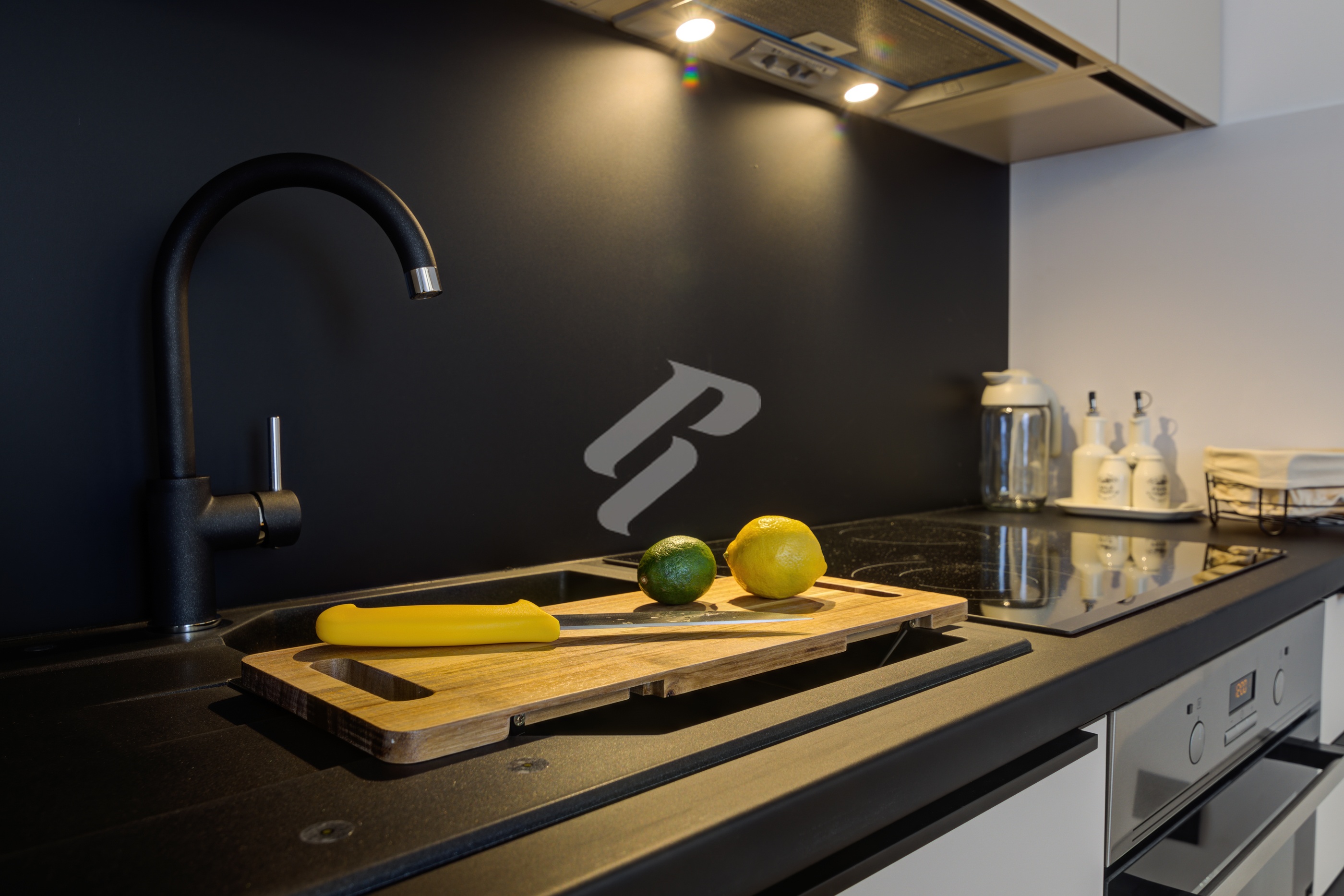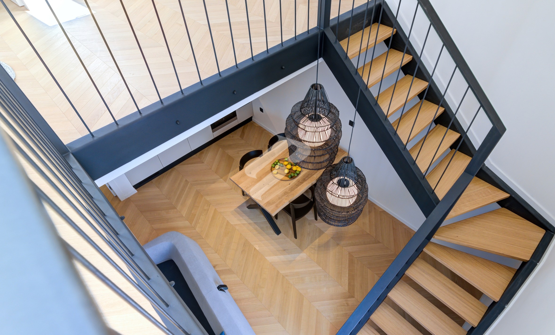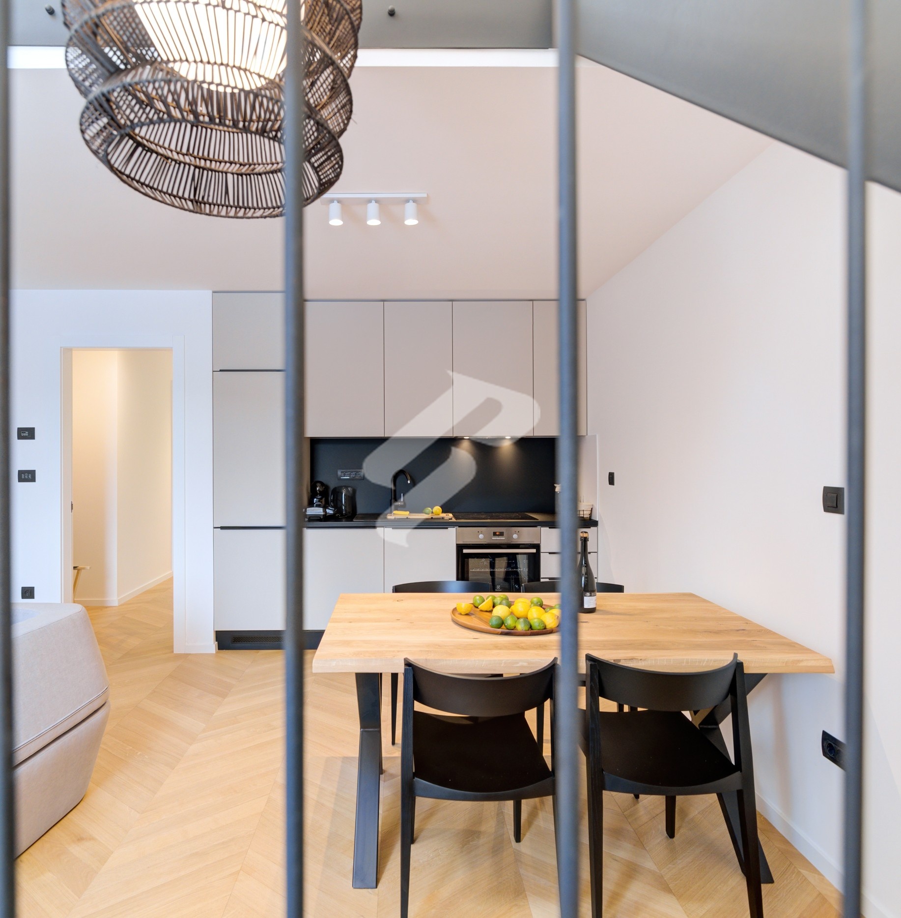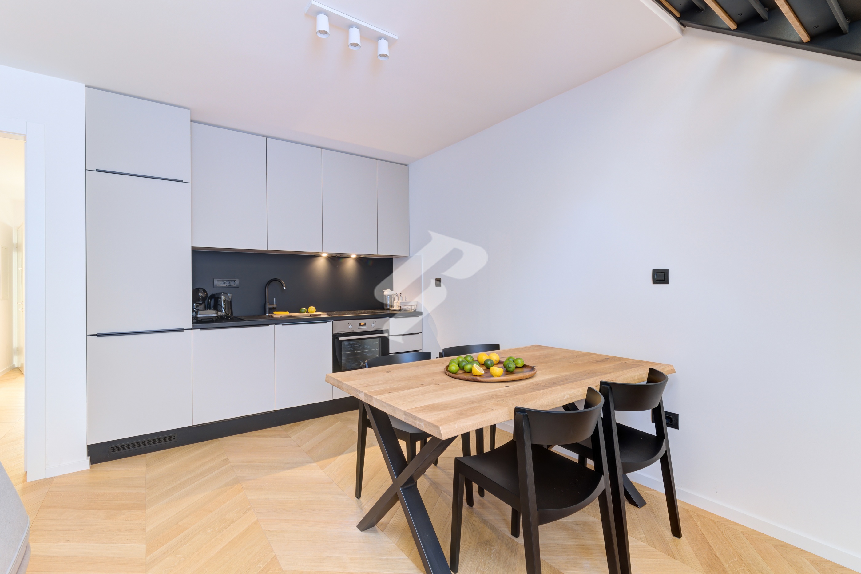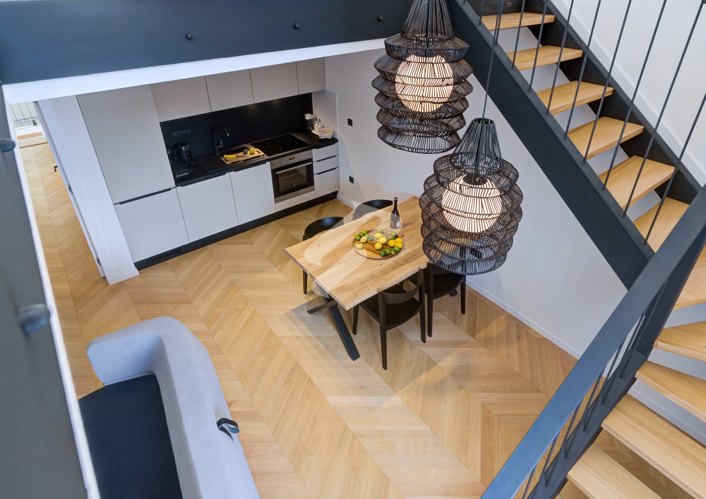 The minimalist kitchen in a sophisticated black-and-white combination is seamlessly integrated into the open-concept layout, while herringbone parquet flooring adds warmth and timeless character. At the center is an elegant dining area, illuminated by designer pendant lighting that creates the atmosphere of a luxurious boutique setting – perfect for dinners and gatherings in refined style.