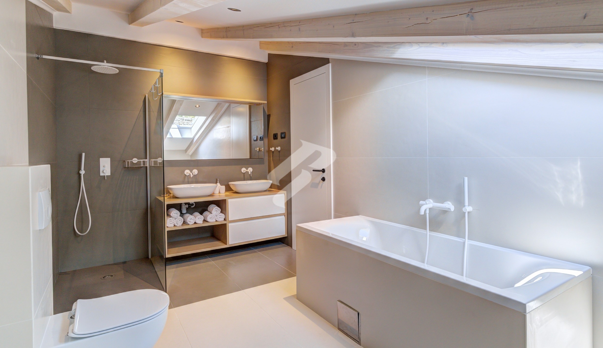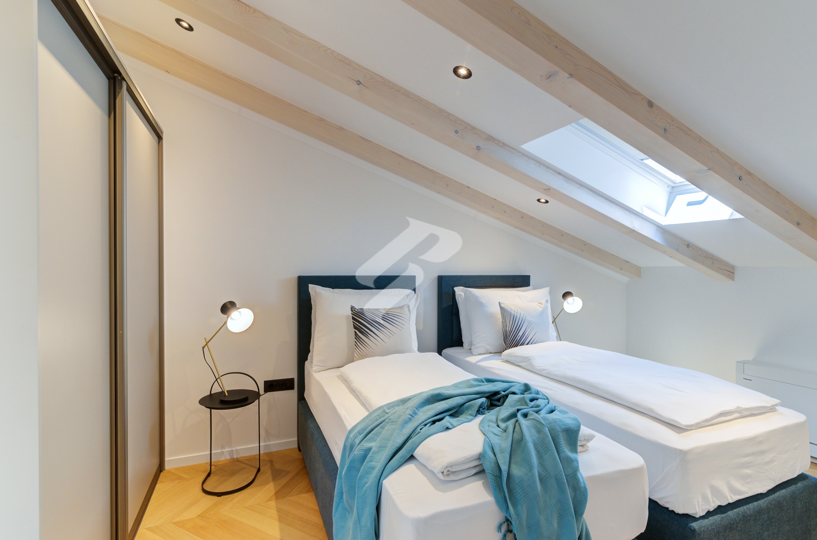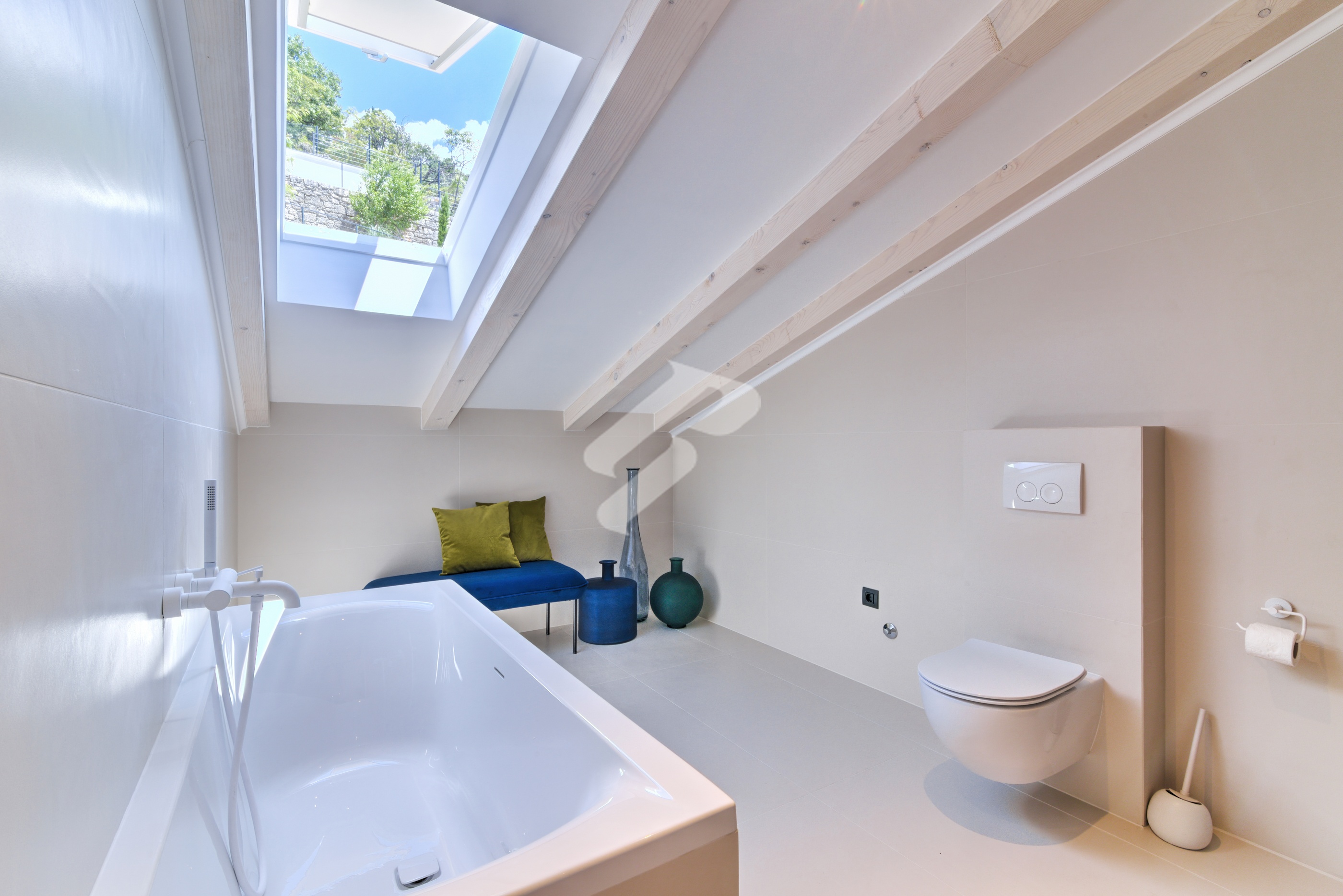 Metal stairs with wooden treads lead to the gallery, where two comfortable bedrooms are designed as private oases of tranquility. The bathroom with skylights further enhances the feeling of airiness and exclusivity, turning everyday life into a ritual of enjoyment.