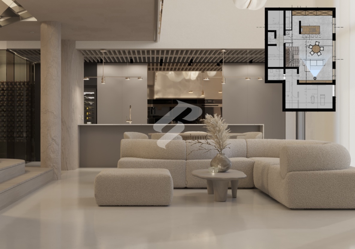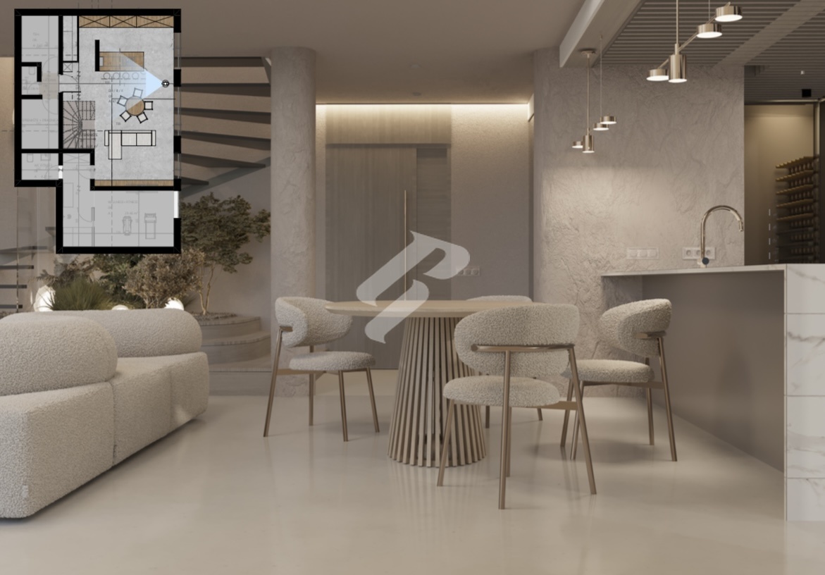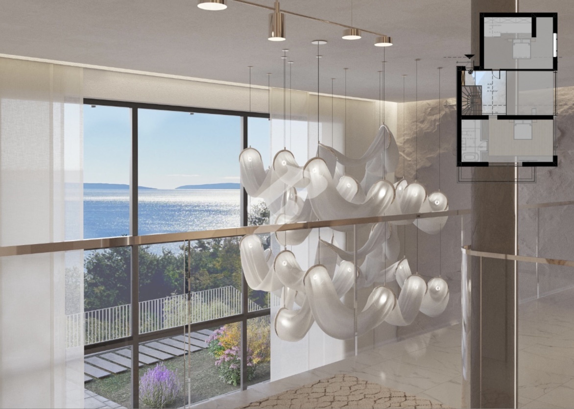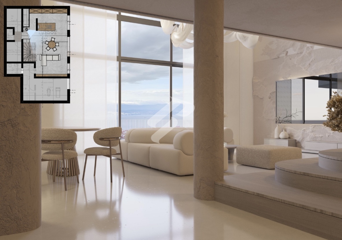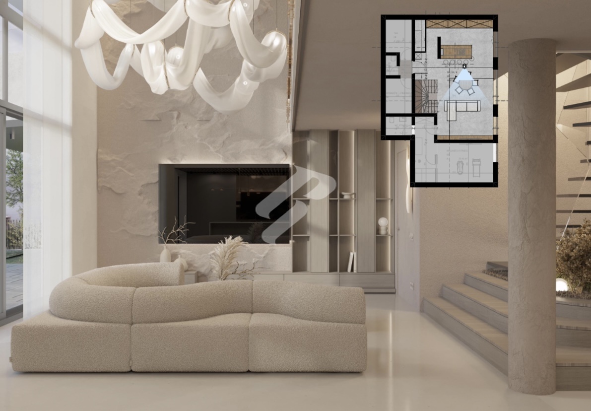 On the first floor there is a fully equipped wellness and fitness area of 29.46 m² with its own WC, ideal for private workouts and relaxation. This level also includes a storage room with laundry, a technical room, an additional guest WC and a spacious living room with a gallery that offers a sense of airiness and a beautiful open sea view, connected to a modern kitchen and dining area.