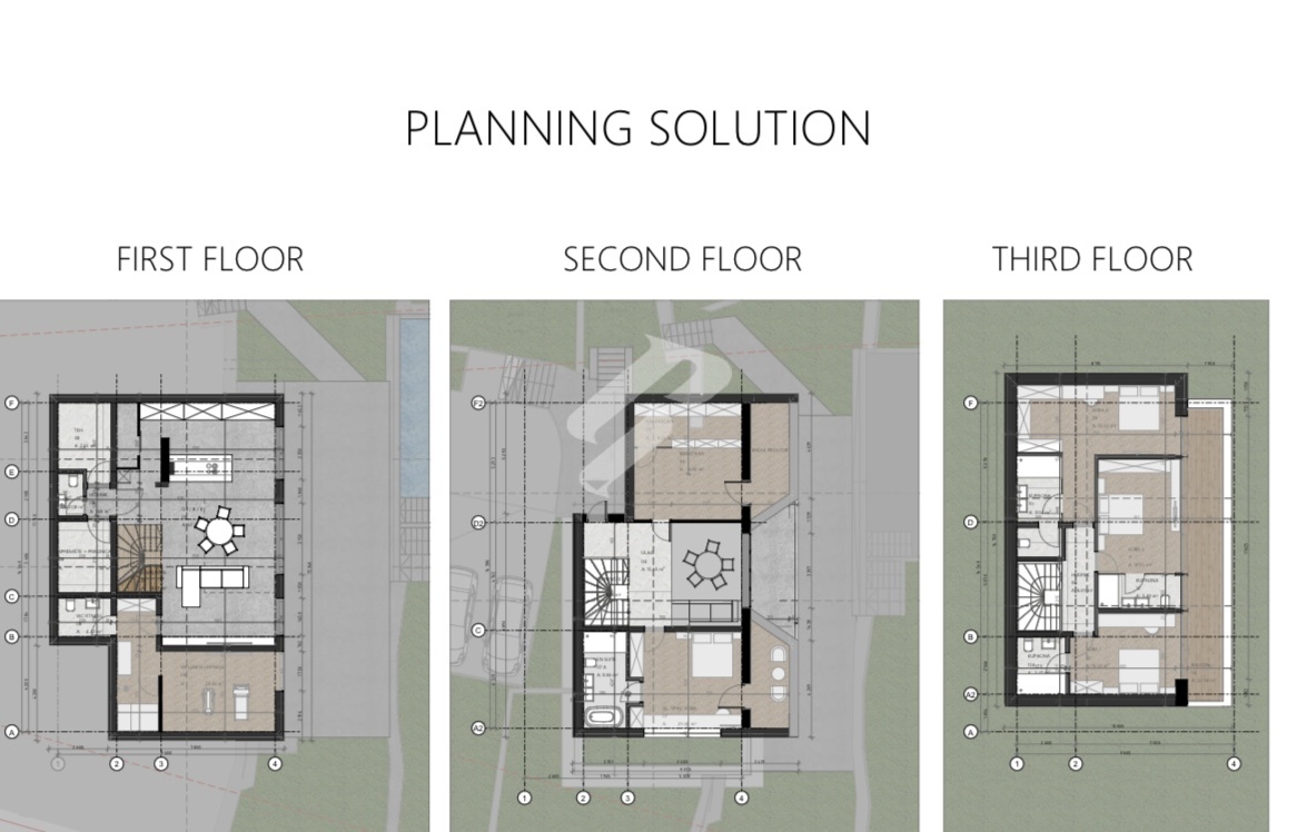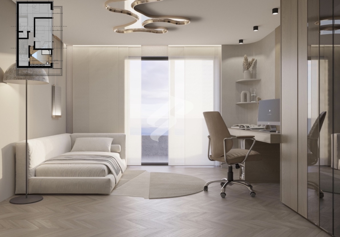 On the top floor there are three additional bedrooms, each with its own bathroom, ensuring luxurious comfort and maximum privacy for family and guests.