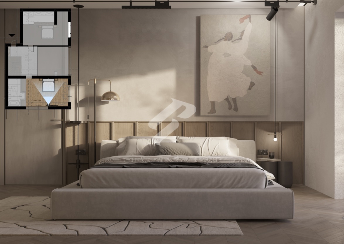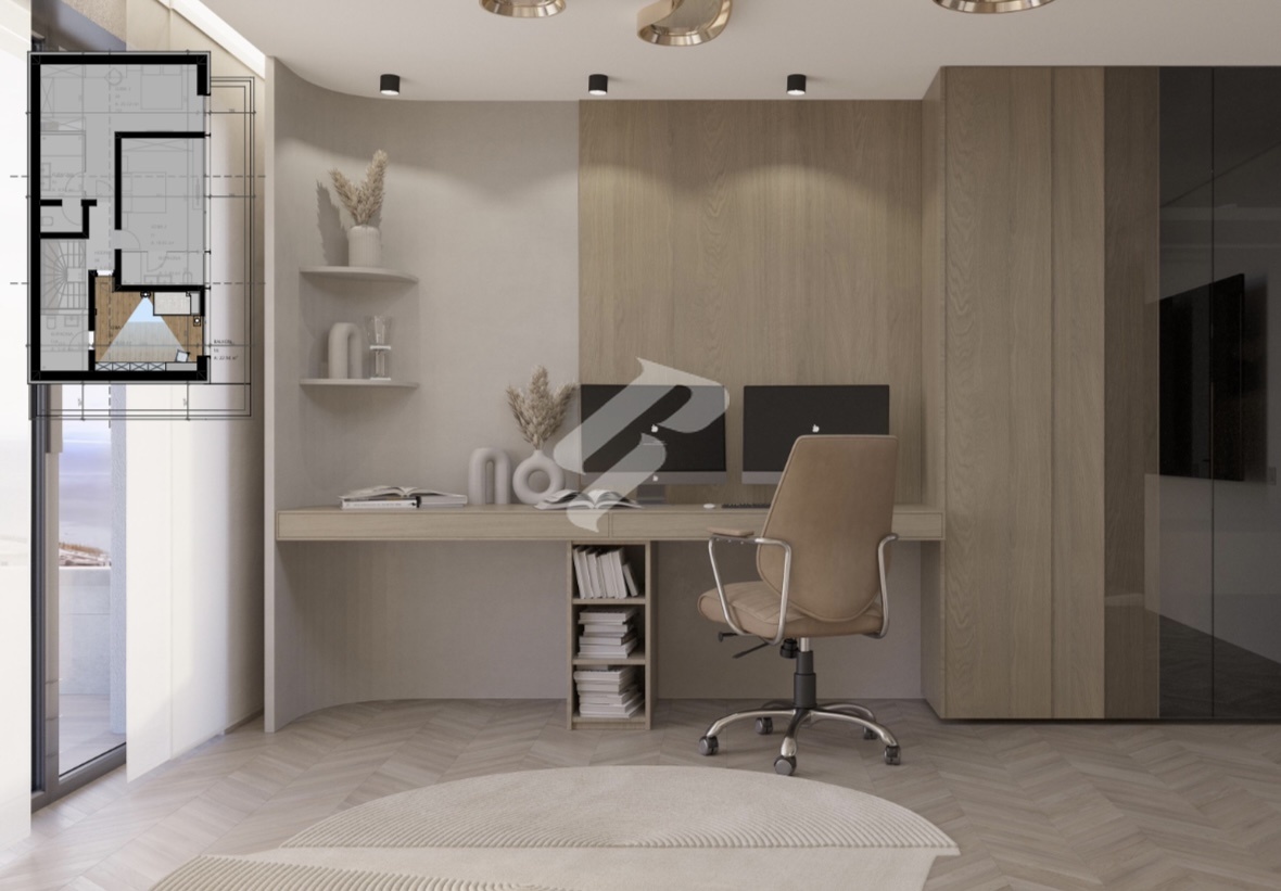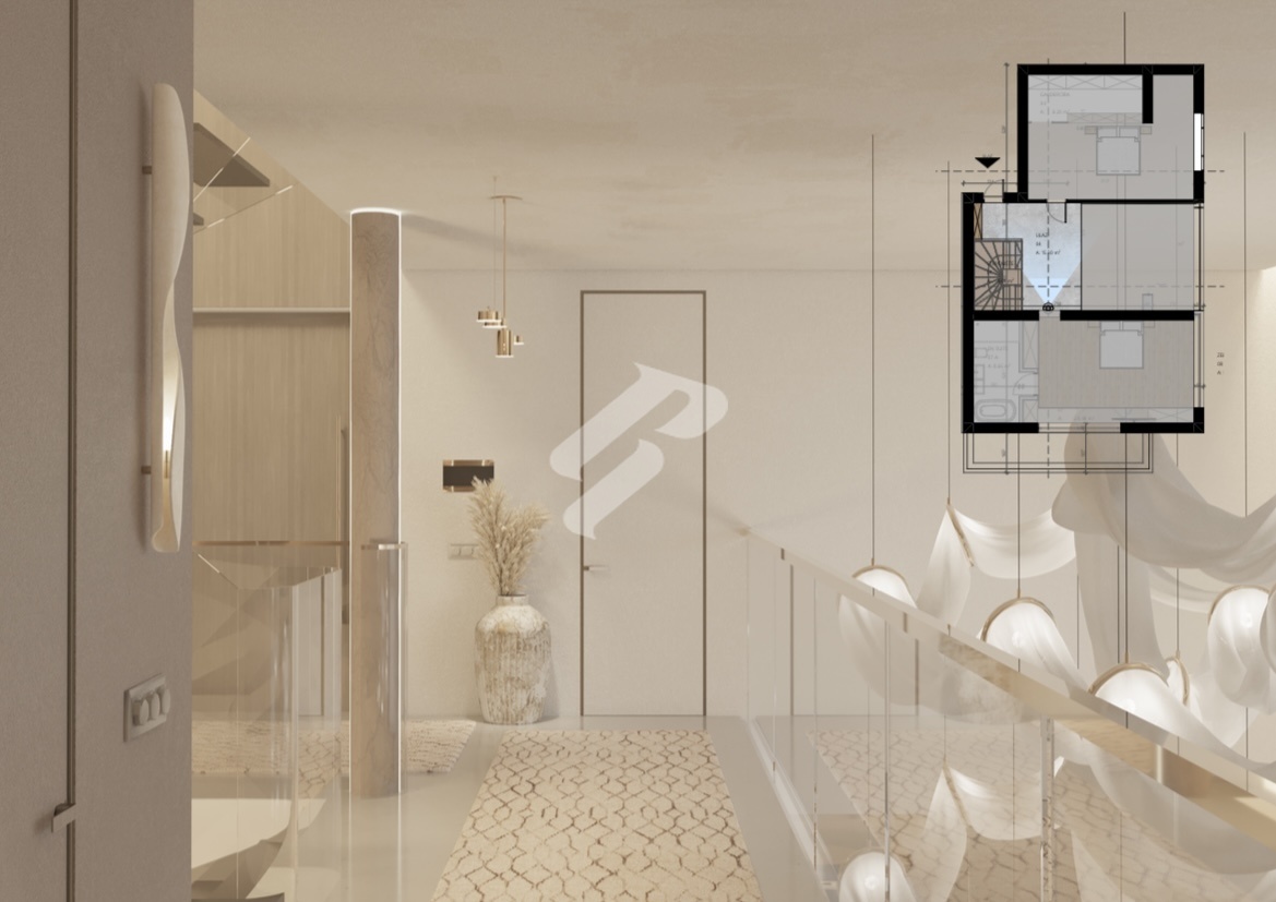 The upper floor offers an elegant library with a wardrobe and a master bedroom with its own bathroom, creating a private oasis for rest and tranquility.