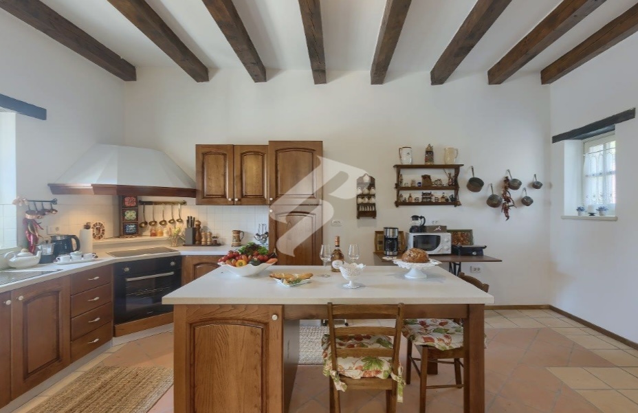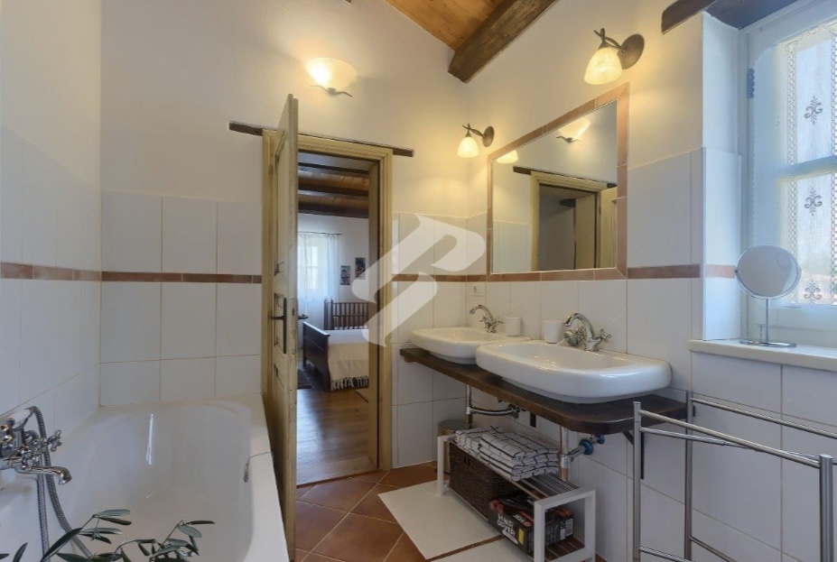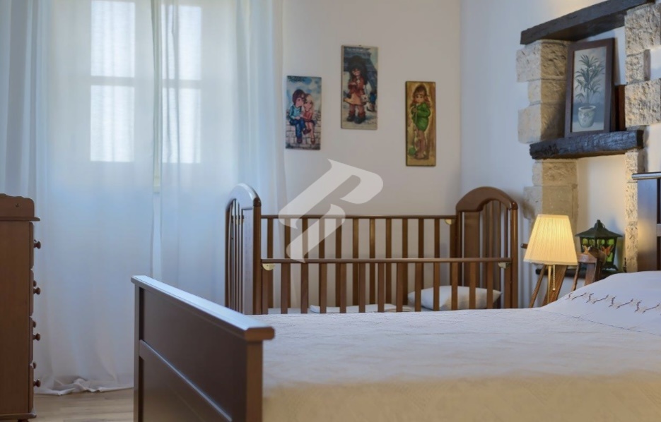 Nella costruzione sono stati utilizzati elementi autentici come pietra nei muretti a secco, travi in legno, persiane in metallo e pavimenti in ardesia intorno alla piscina, mentre la terrazza coperta permette di godersi i pasti all’aperto. Al piano terra si trovano una spaziosa cucina in legno massello, una zona lavanderia, una lavanderia, una sala da pranzo e un soggiorno con due divani letto, che conduce alla terrazza coperta. Un bagno per gli ospiti completa il piano terra, mentre il camino interno a legna insieme al riscaldamento a pavimento offre calore e un’atmosfera accogliente durante tutto l’anno.