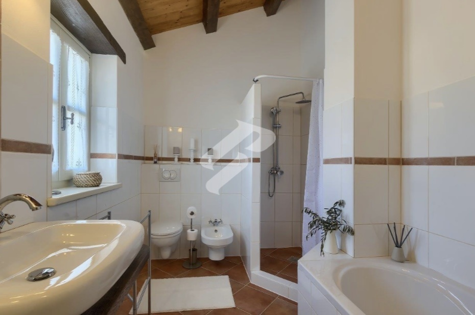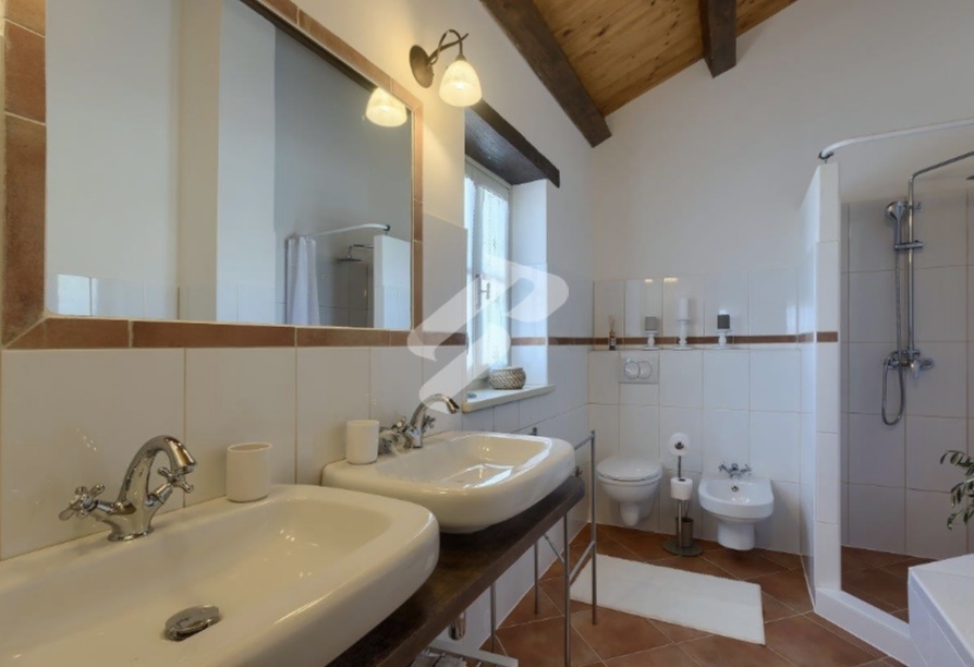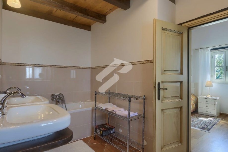 Al piano superiore ci sono tre camere da letto lussuose con parquet in legno, ciascuna con bagno privato dotato di vasca, doccia, bidet e doppi lavandini. La camera matrimoniale dispone di letto matrimoniale 180 x 200 cm e ampi armadi in legno, mentre le altre due camere offrono letti comodi per la famiglia o gli ospiti. Il balcone con zona salotto offre una vista sul verde, e il terreno adiacente non è edificabile, garantendo privacy e tranquillità. Le camere da letto sono dotate di aria condizionata con riscaldamento e raffreddamento, e le scale combinano terracotta e legno.