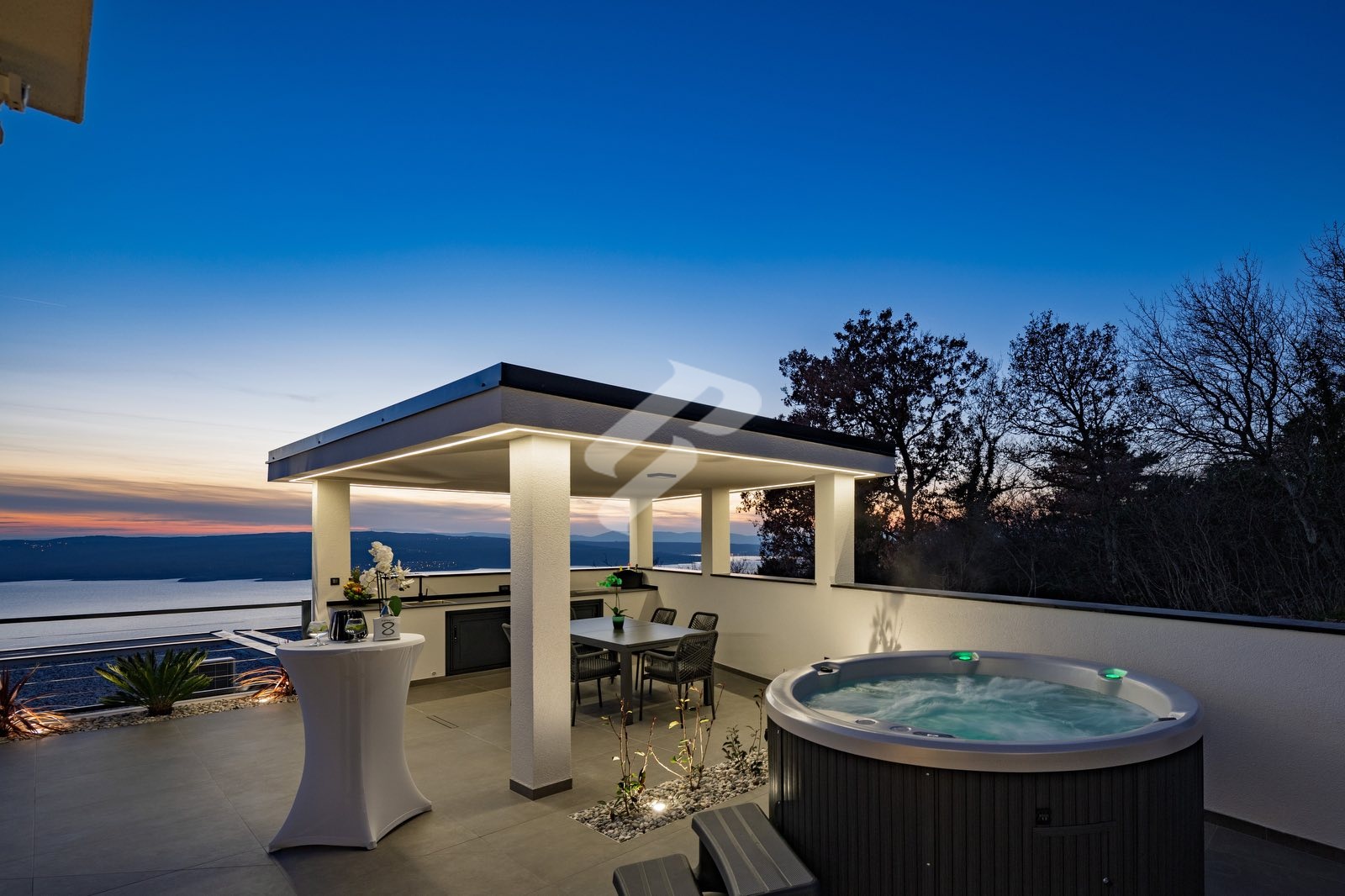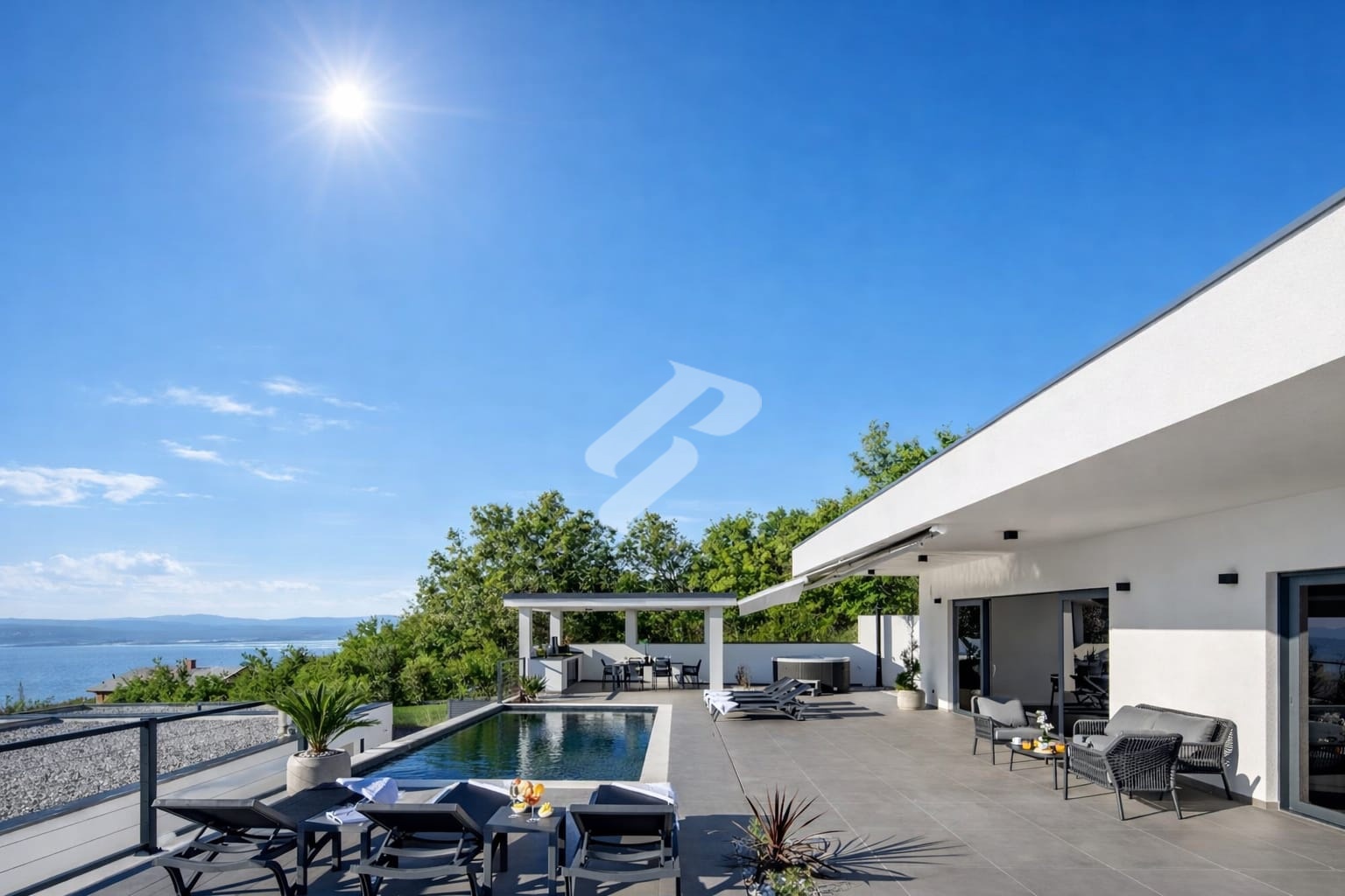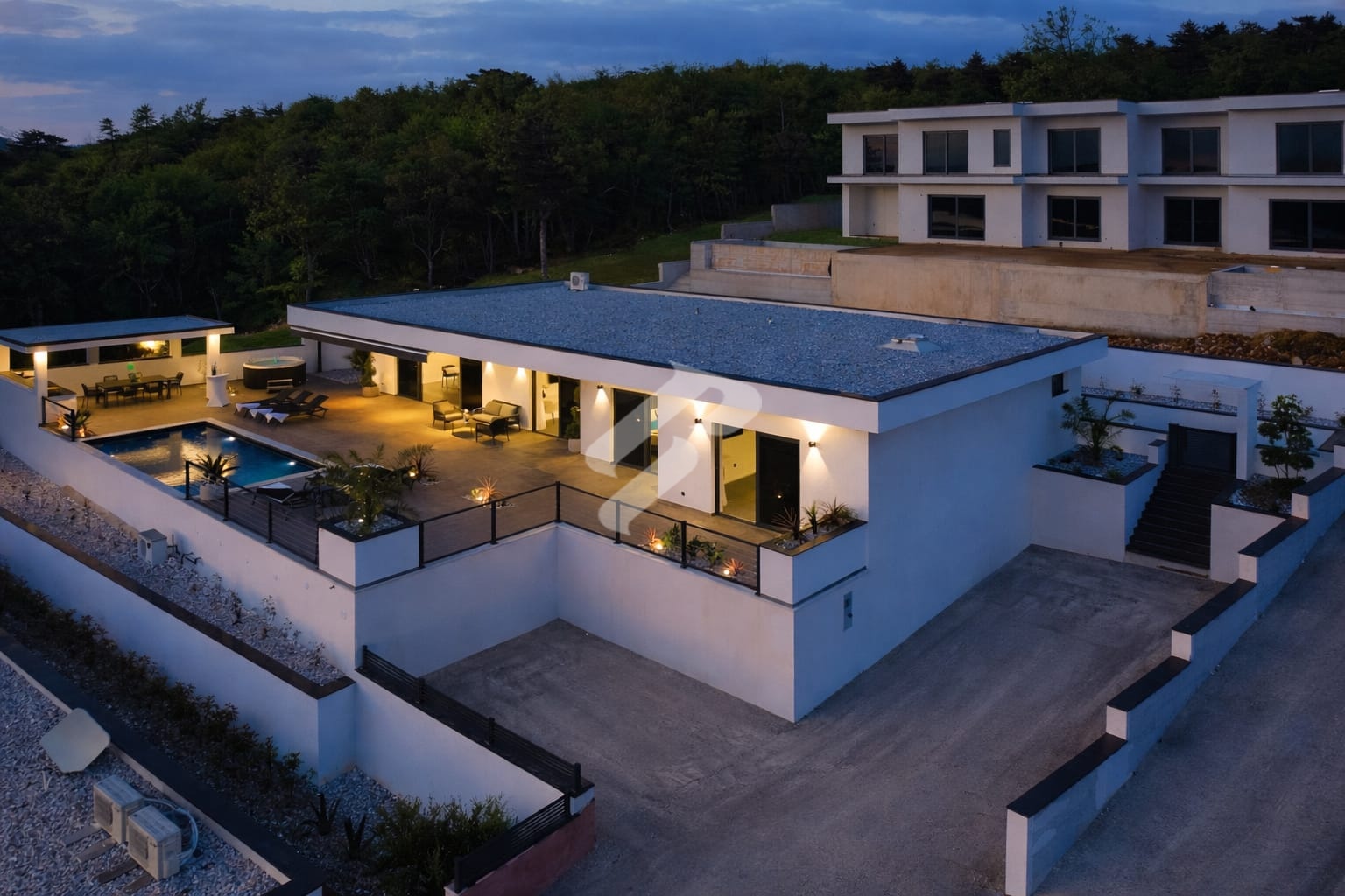 Na mirnoj i diskretnoj lokaciji, gdje tišina i privatnost čine svakodnevicu, smjestila se ova elegantna prizemnica modernog dizajna s očaravajućim, otvorenim pogledom na čitav Kvarner.