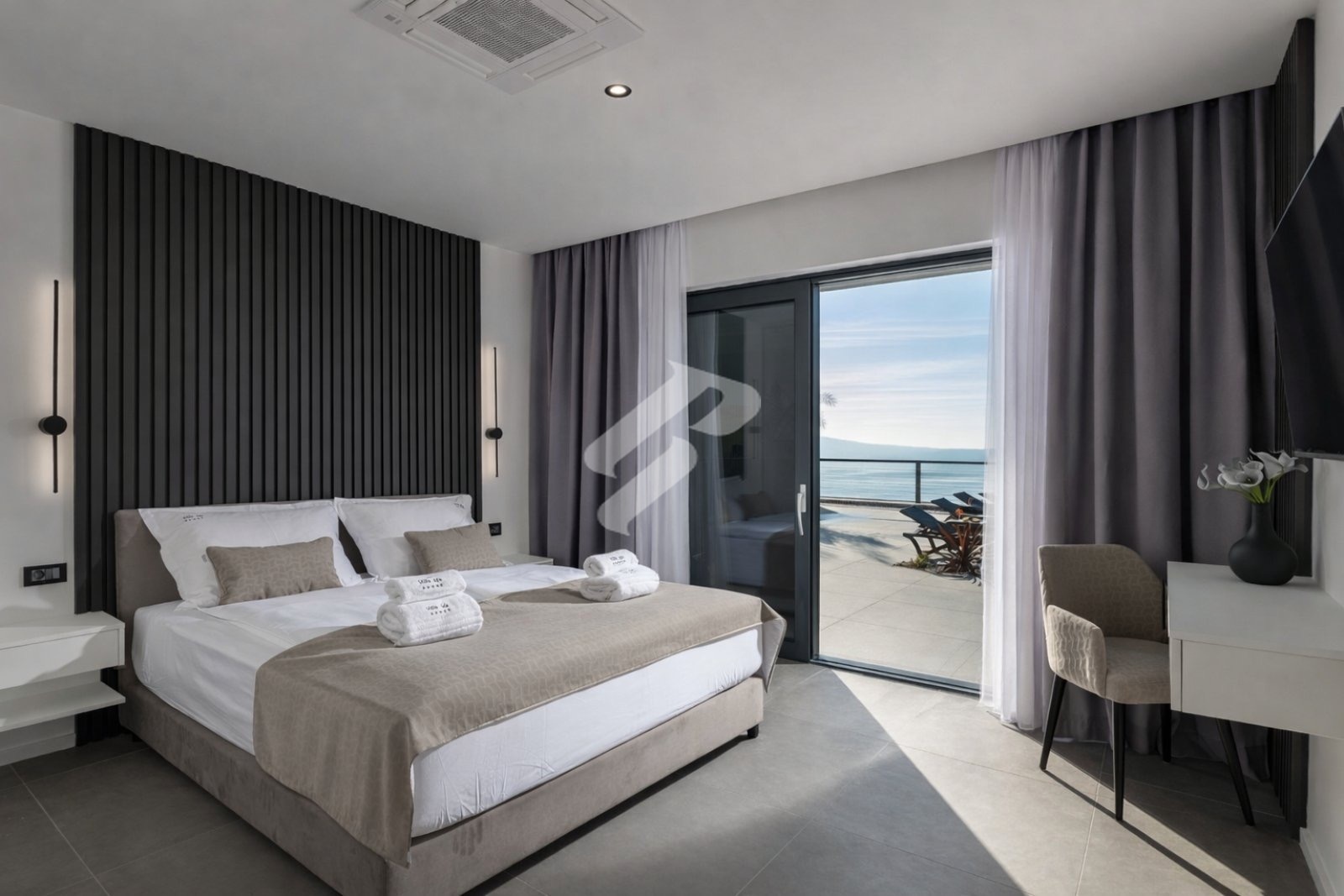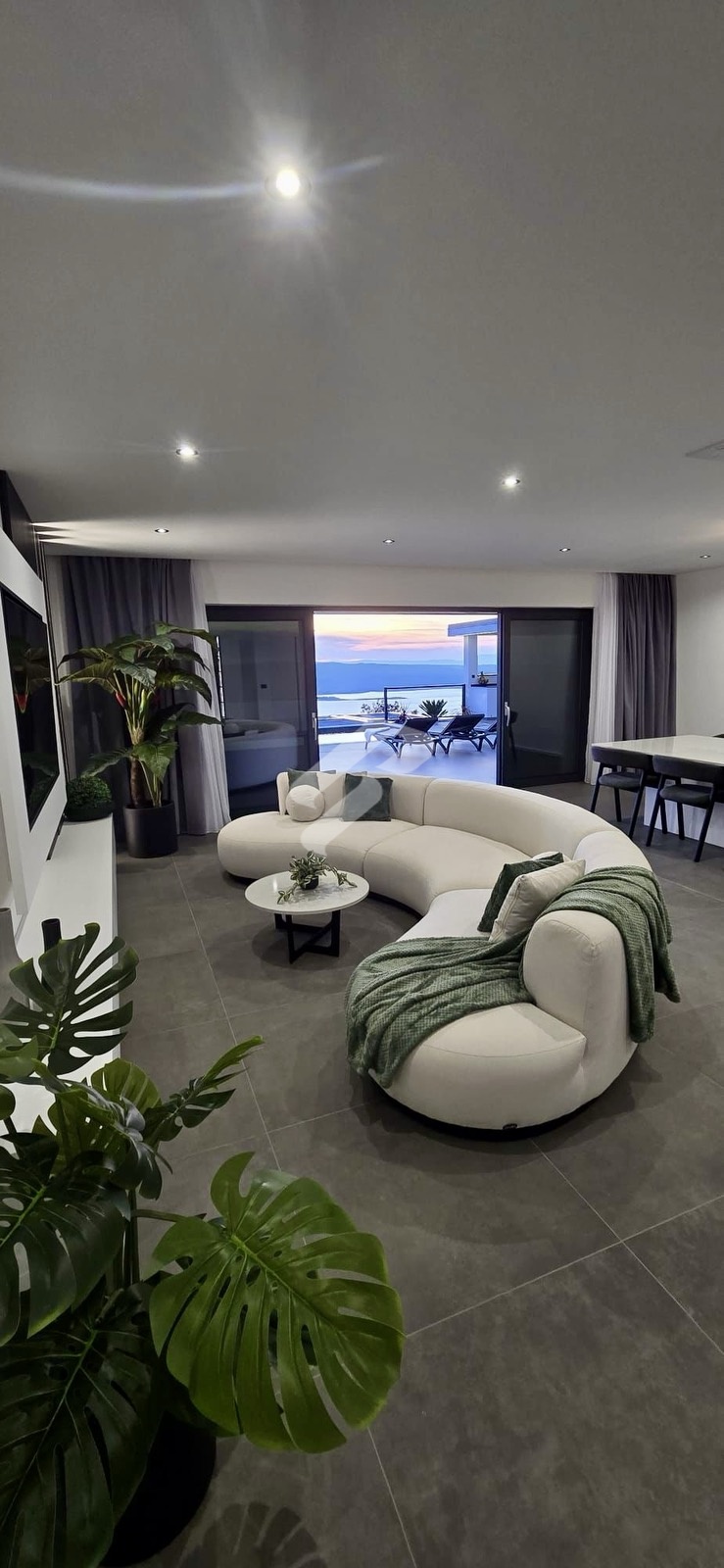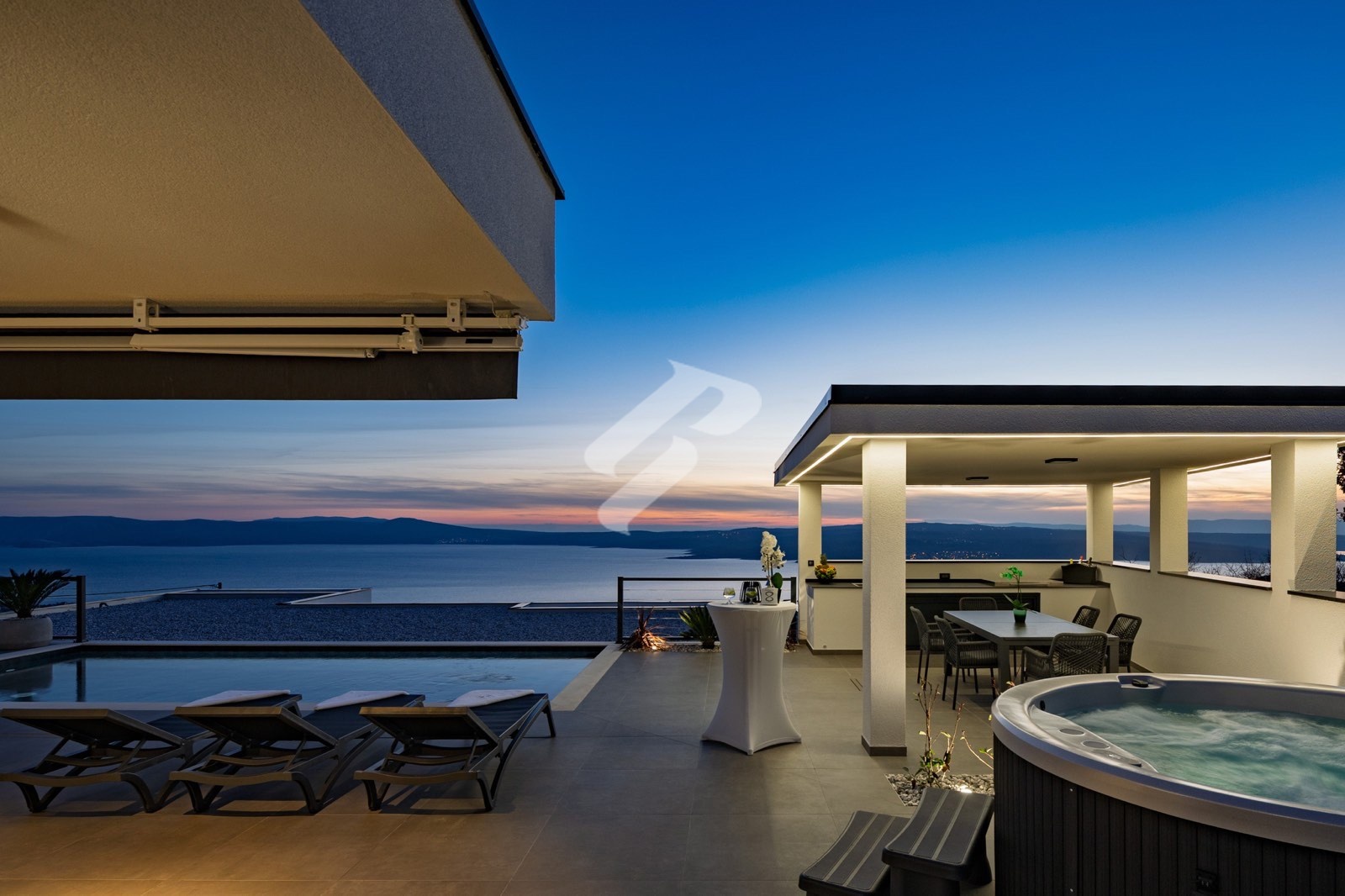 Na mirnoj i diskretnoj lokaciji, gdje tišina i privatnost čine svakodnevicu, smjestila se ova elegantna prizemnica modernog dizajna s očaravajućim, otvorenim pogledom na čitav Kvarner.