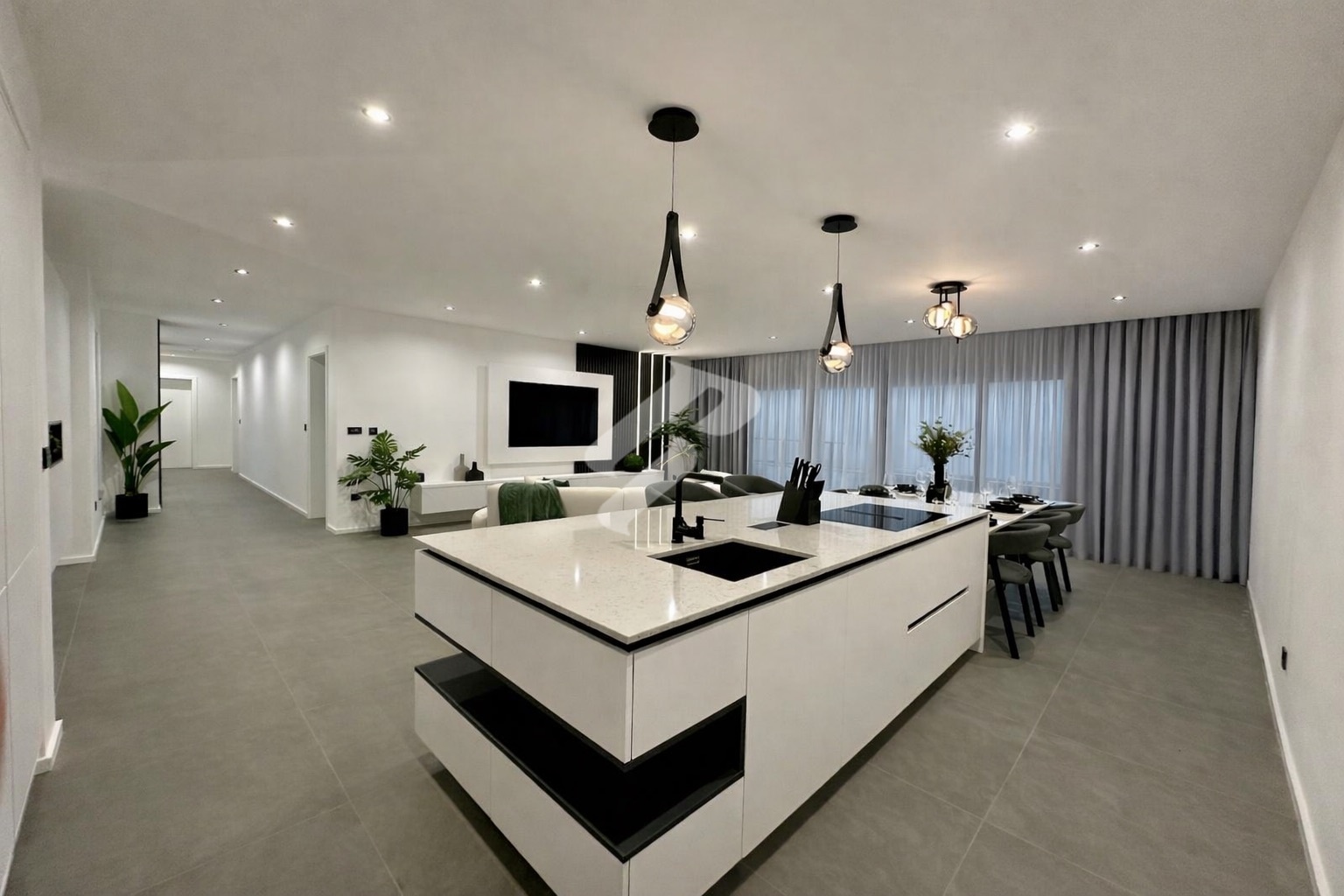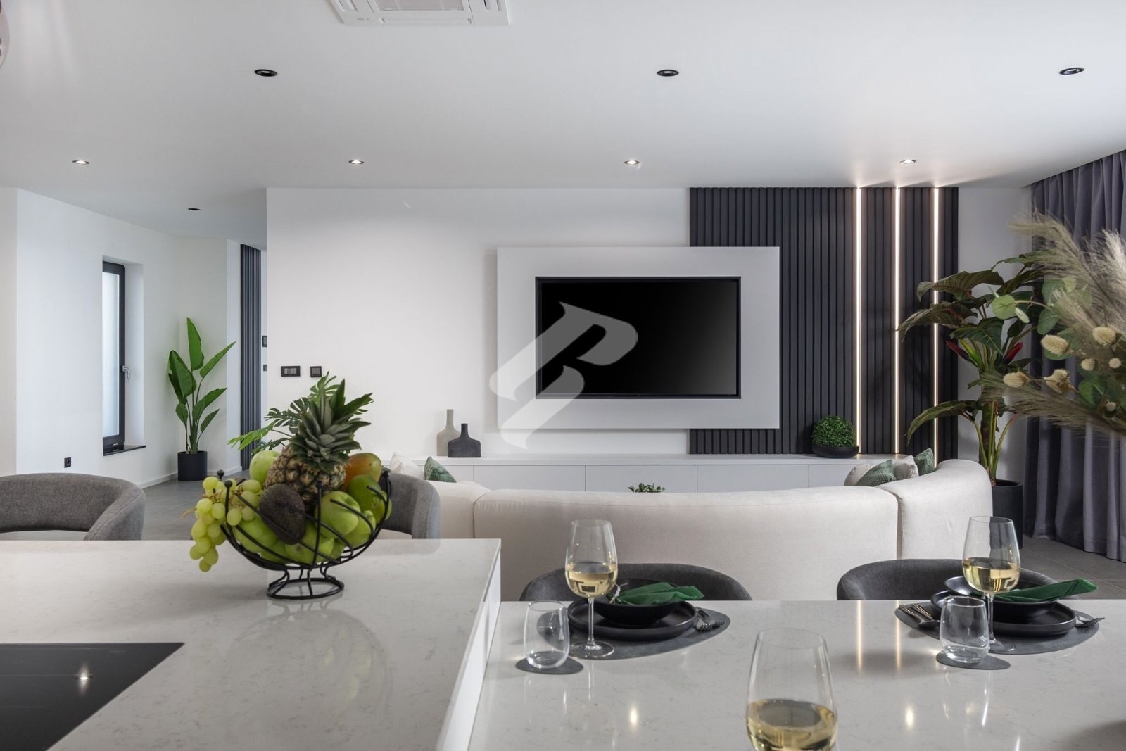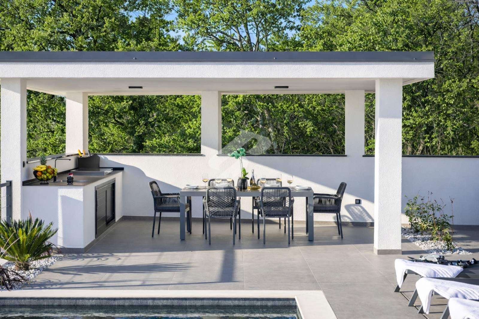 Srce doma čini prostrani dnevni boravak ispunjen prirodnim svjetlom, koji se elegantno nastavlja na terasu s bazenom i natkrivenom ljetnom kuhinjom – savršen prostor za druženja, uživanje i nezaboravne trenutke na otvorenom. Kuhinja s otokom, potpuno opremljena i namještena, dizajnirana je za praktičnost i užitak u svakodnevnom životu.
