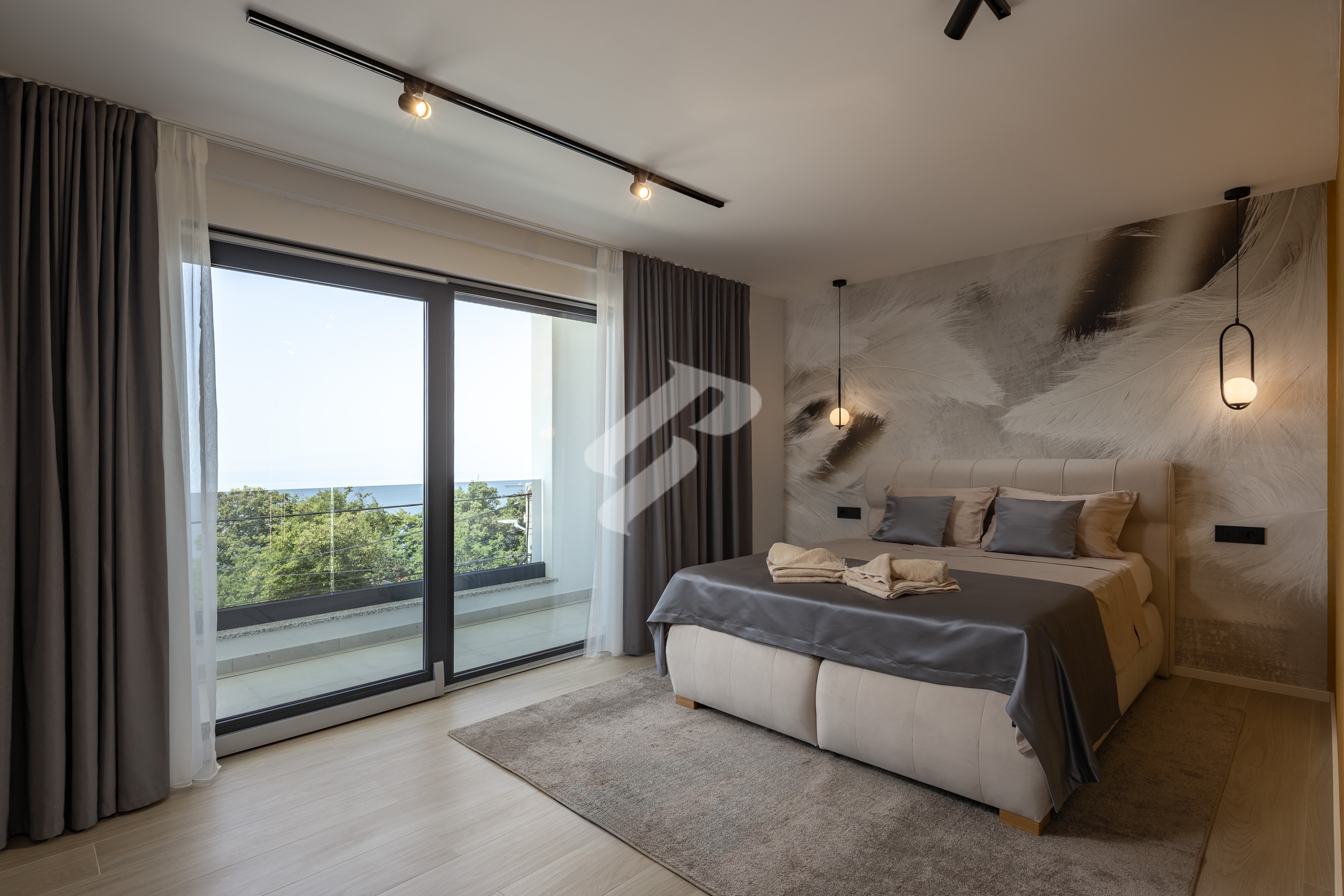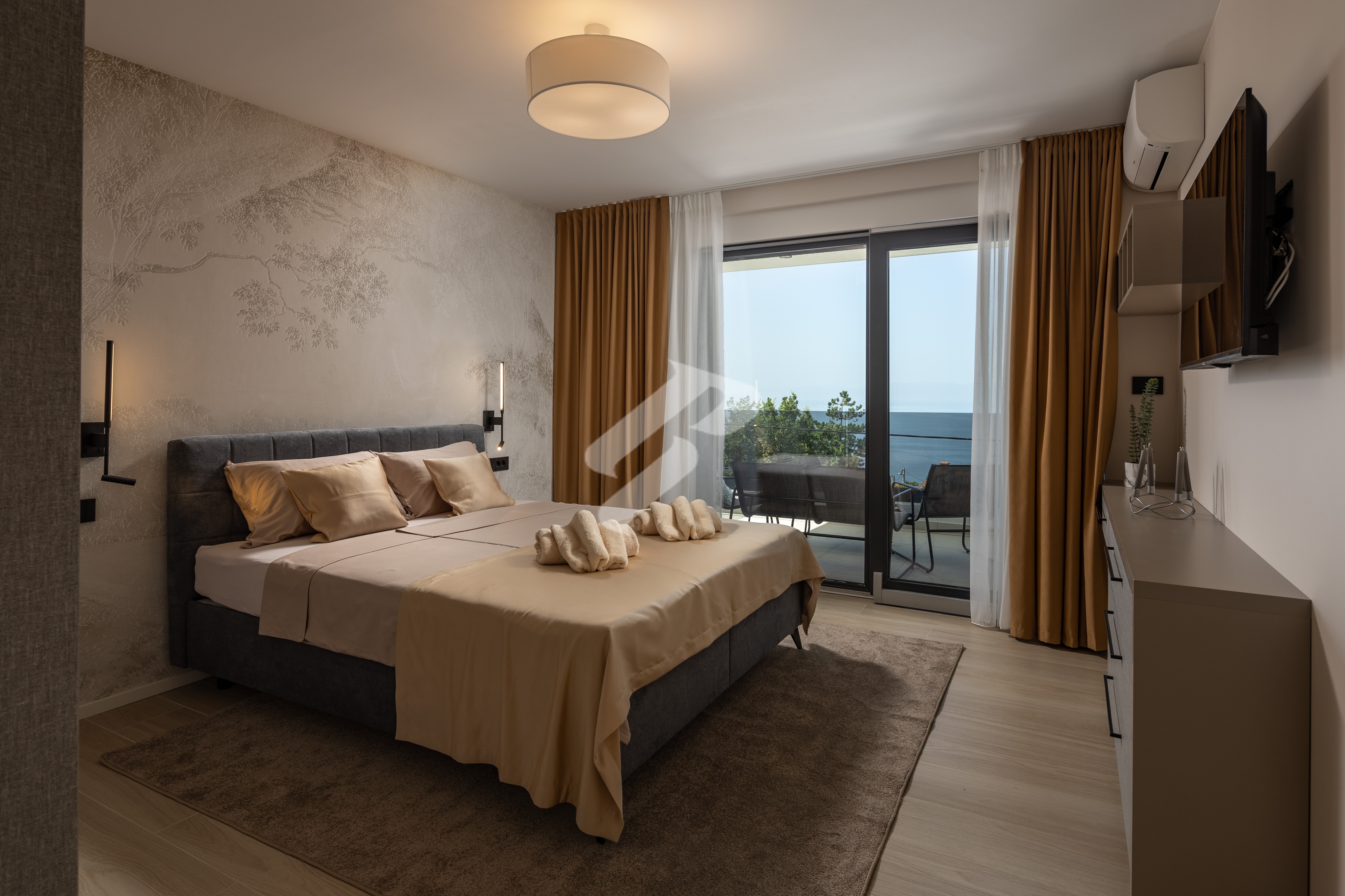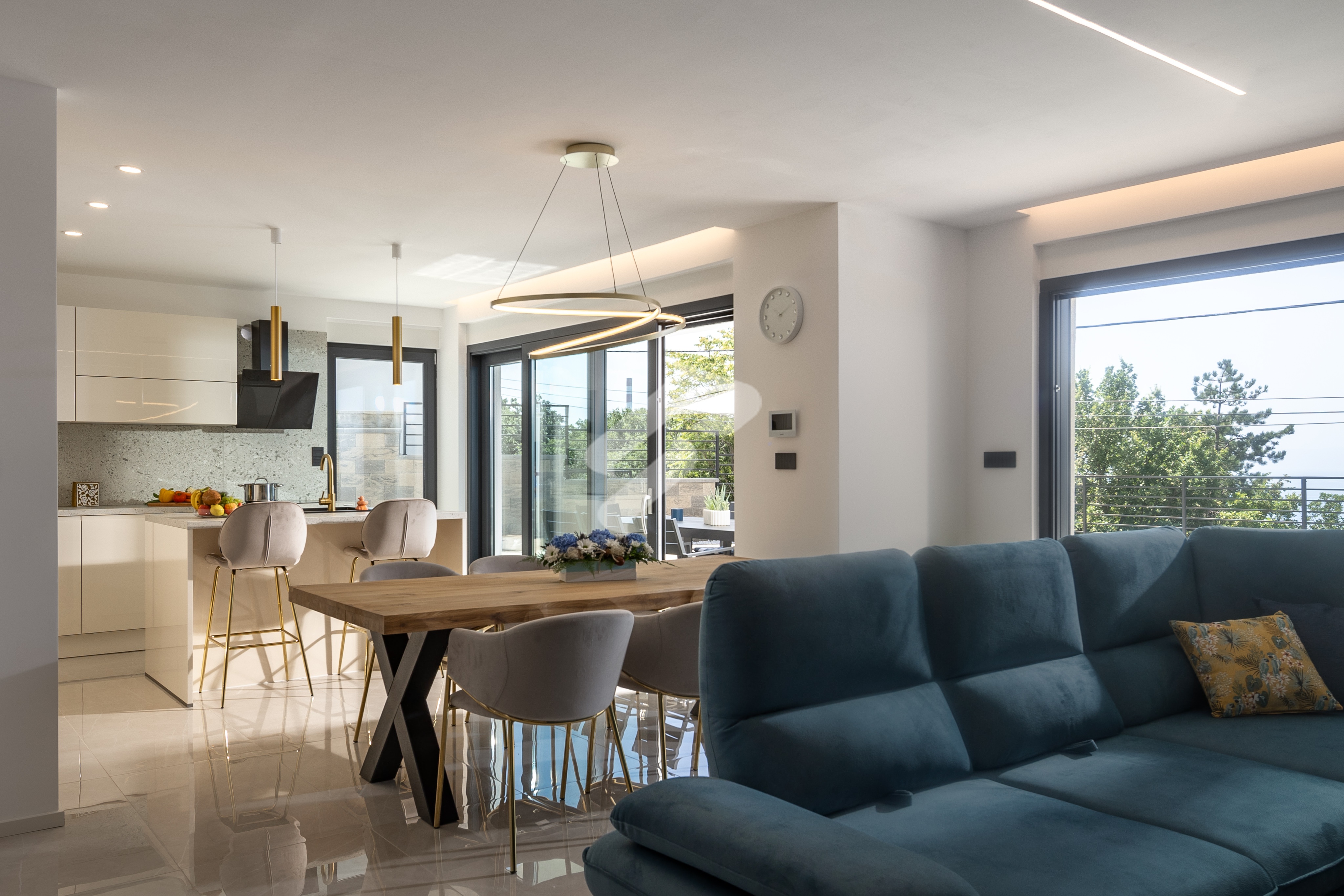 Luksuzna dvojna kuća, u opisu istočna polovica, izgrađena 2024. godine, smještena je u mirnoj i prestižnoj zoni Kostrene, s pogledom na more i svjetlom koje prirodno ispunjava sve prostorije.
