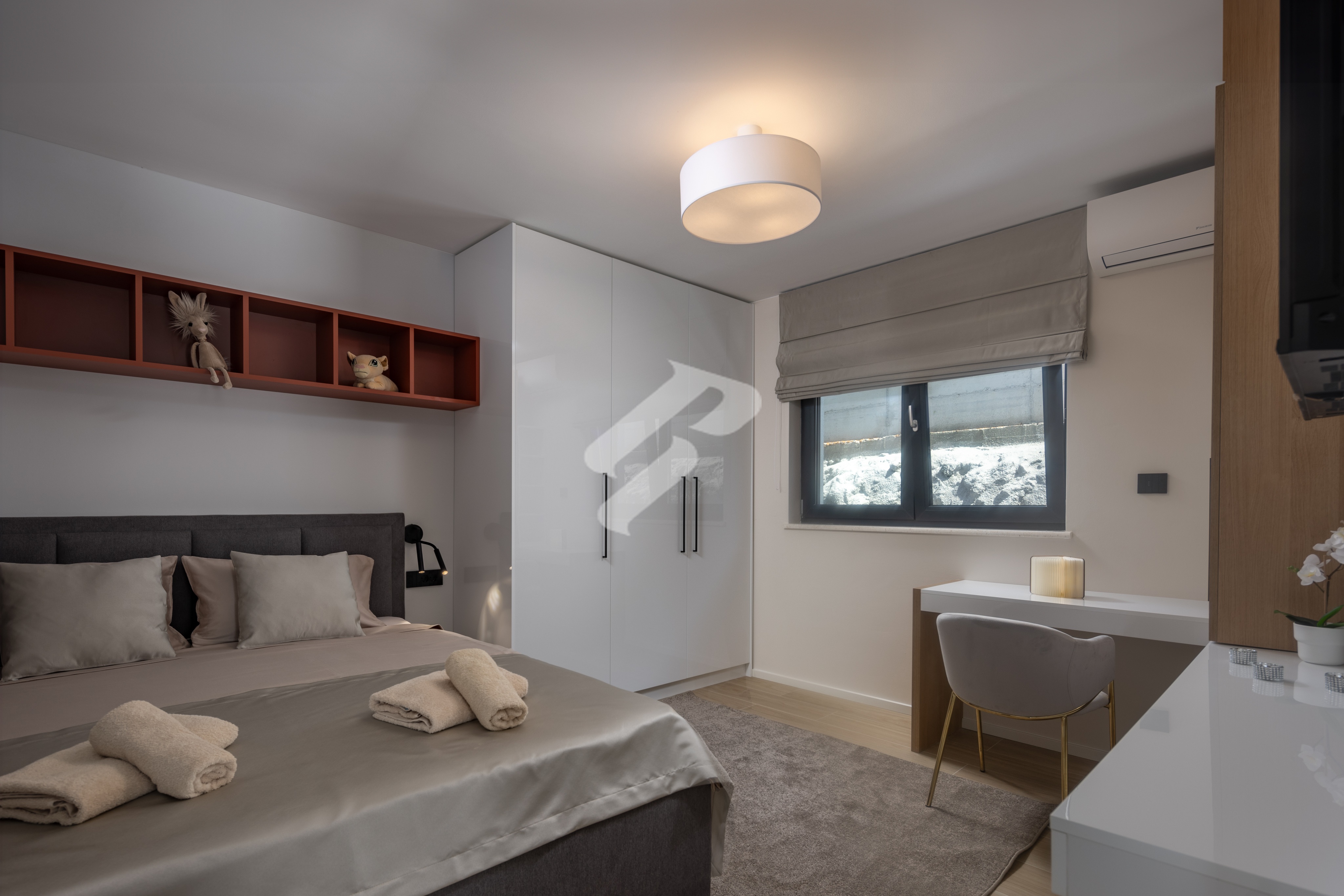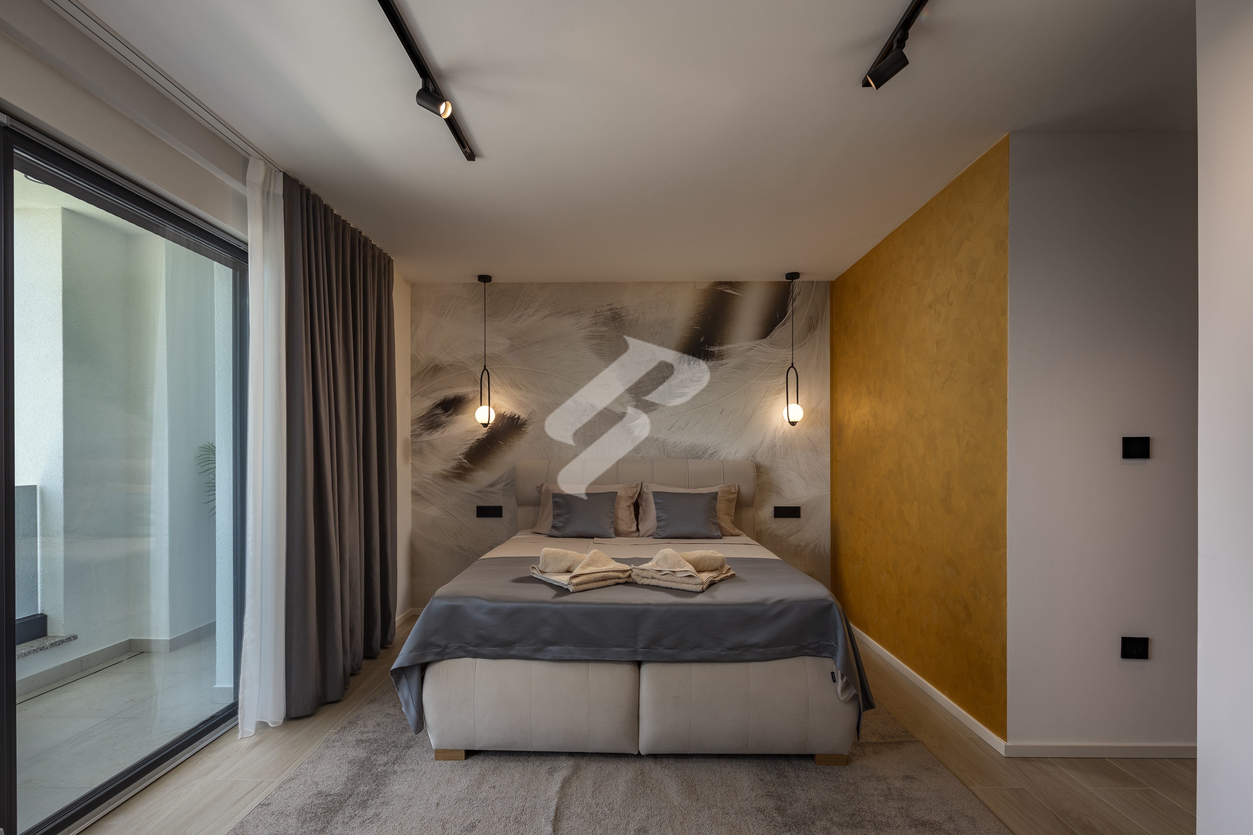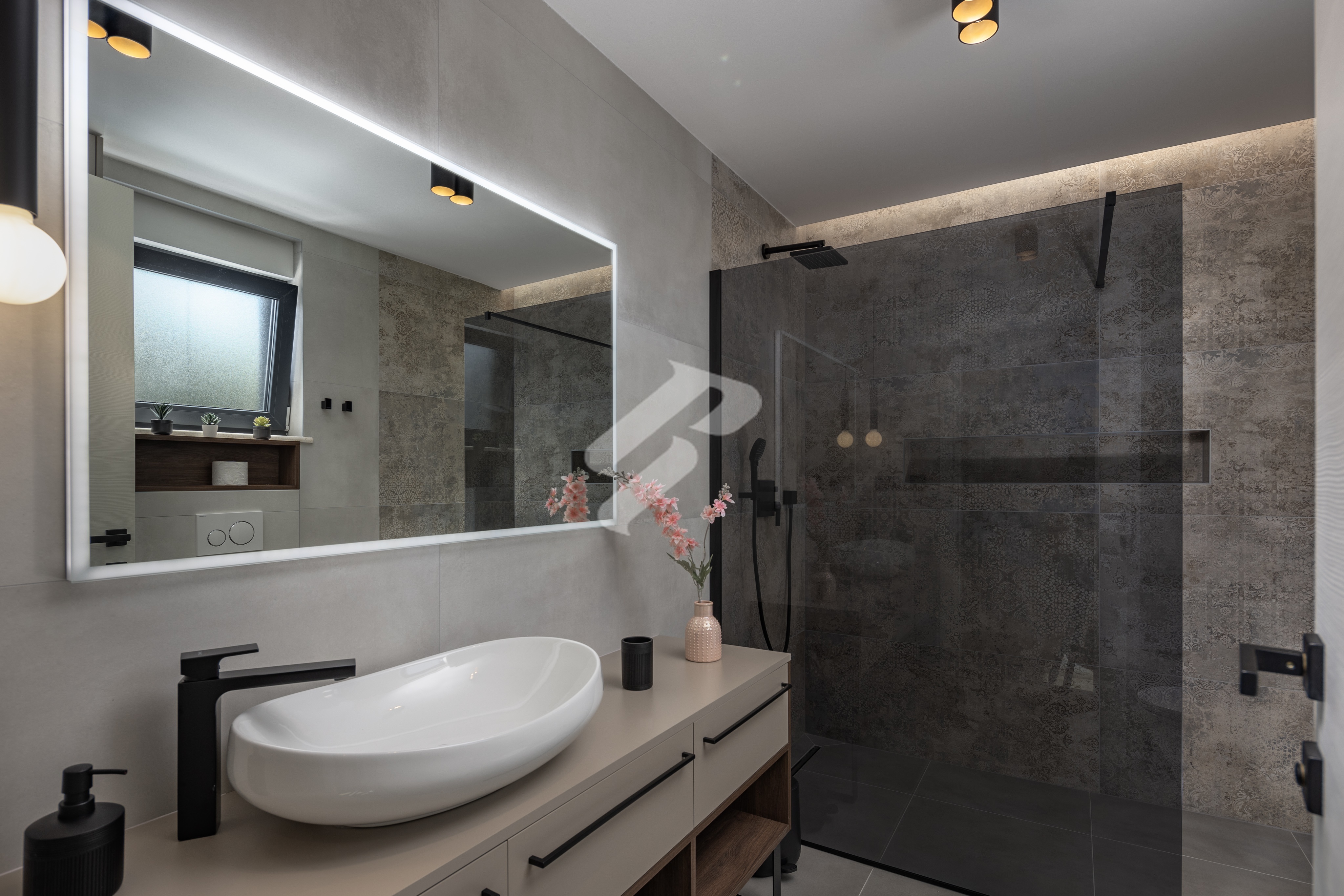 Na prvom katu smještene su tri spavaće sobe, uključujući master suite s privatnim luksuznim kupatilom. Preostale dvije sobe koriste dodatnu kupaonicu smještenu na hodniku. Pažljivo odabrani materijali i obilje prirodnog svjetla stvaraju osjećaj elegancije i mira.