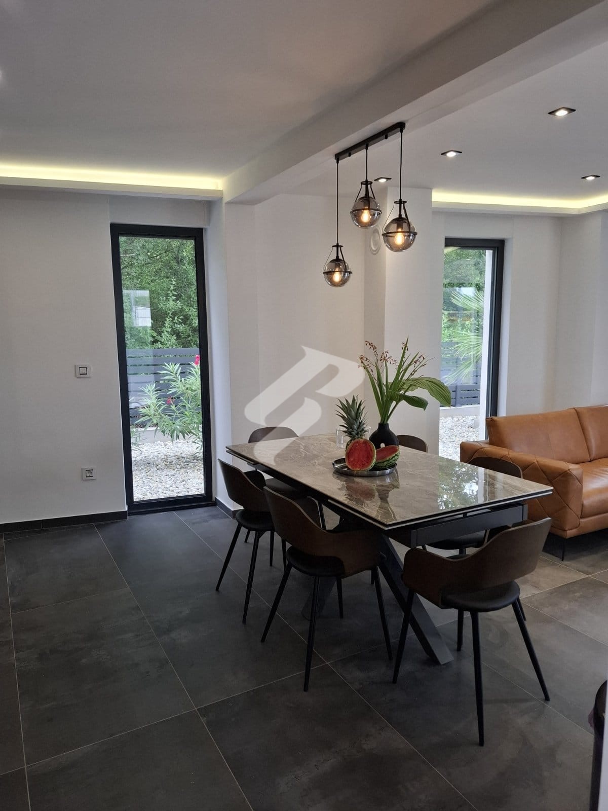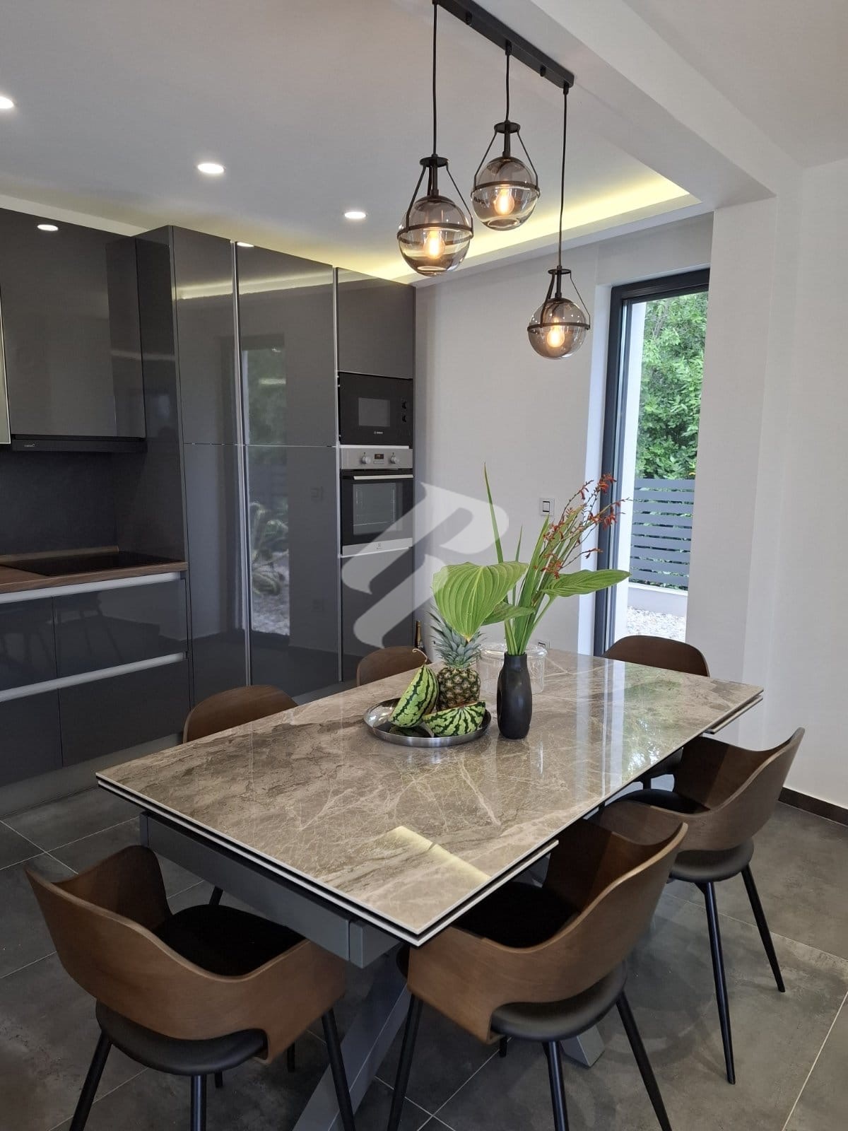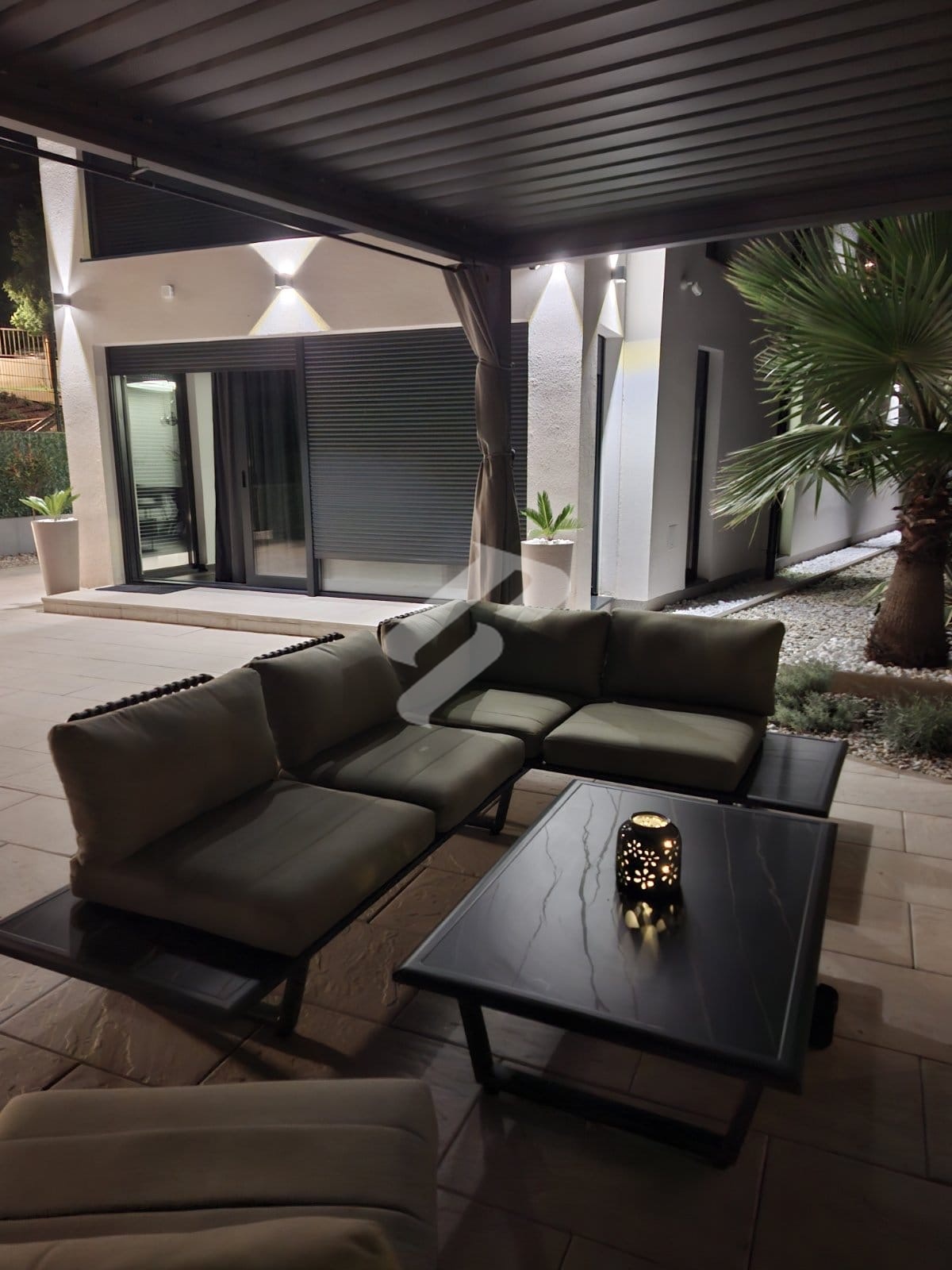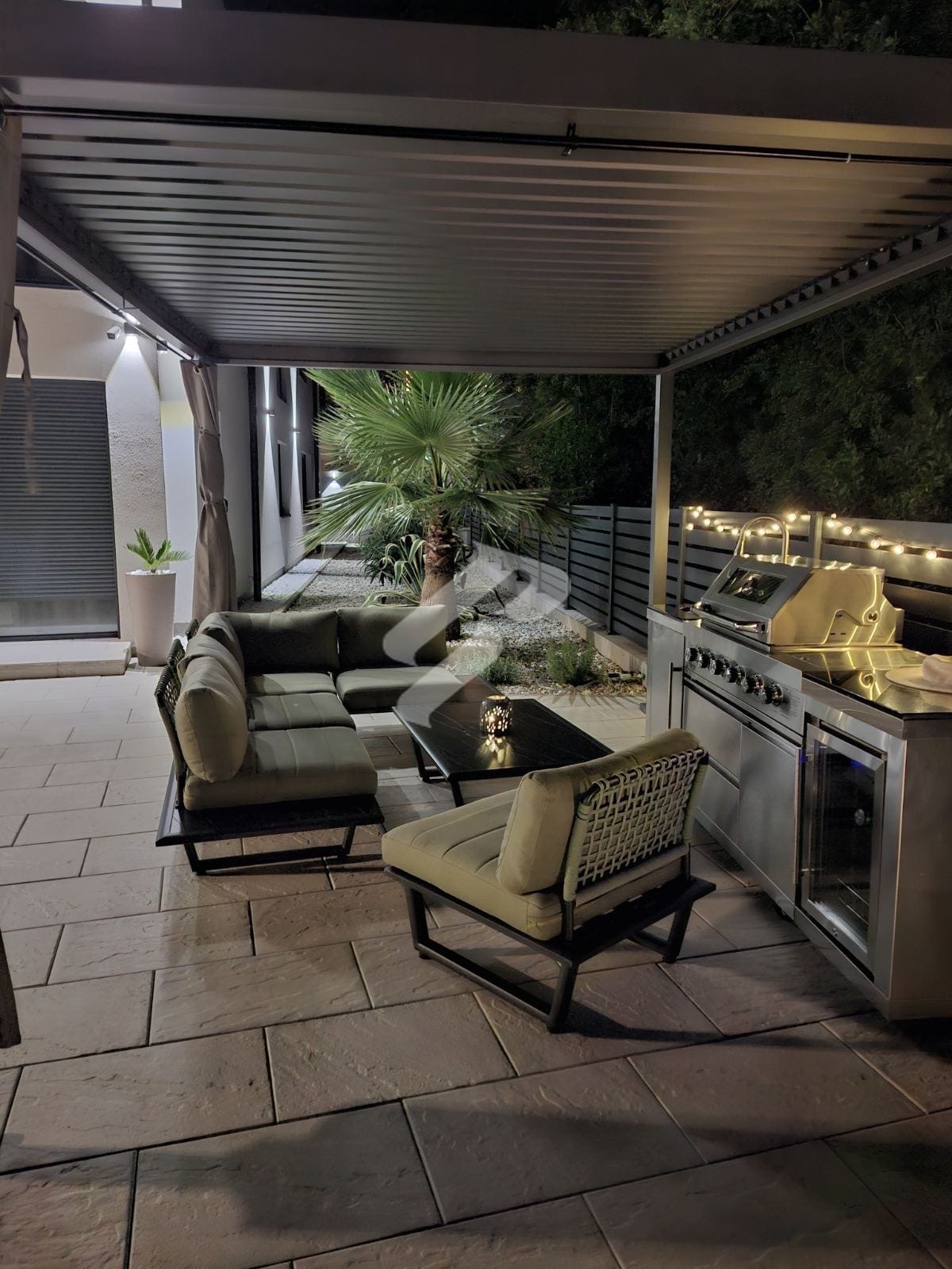 Vanjski dio imanja oblikovan je za uživanje u mediteranskom načinu života. U prednjem dijelu dvorišta nalazi se uređeni prostor veličine 100 m² s natkrivenom pergolom i potpuno opremljenom vanjskom kuhinjom, stvarajući savršeno mjesto za okupljanja i druženja tijekom toplih večeri.