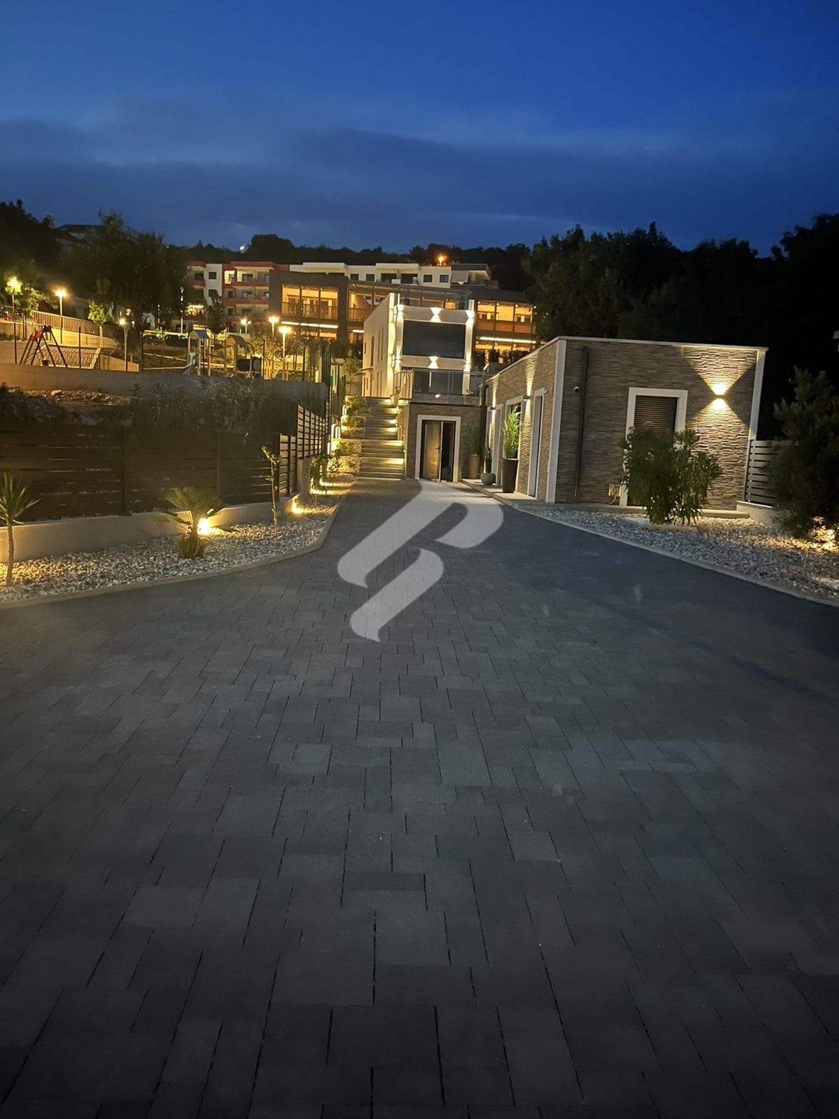 Cijelo imanje ograđeno je luksuznom aluminijskom ogradom u duljini od 185 metara, uz automatske ulazne kapije koje omogućuju potpunu sigurnost i kontroliran pristup. Na ulazu se nalazi šest parkirnih mjesta, uključujući jedno natkriveno, a ravna konfiguracija terena omogućuje i smještaj manje brodice na suhom vezu.