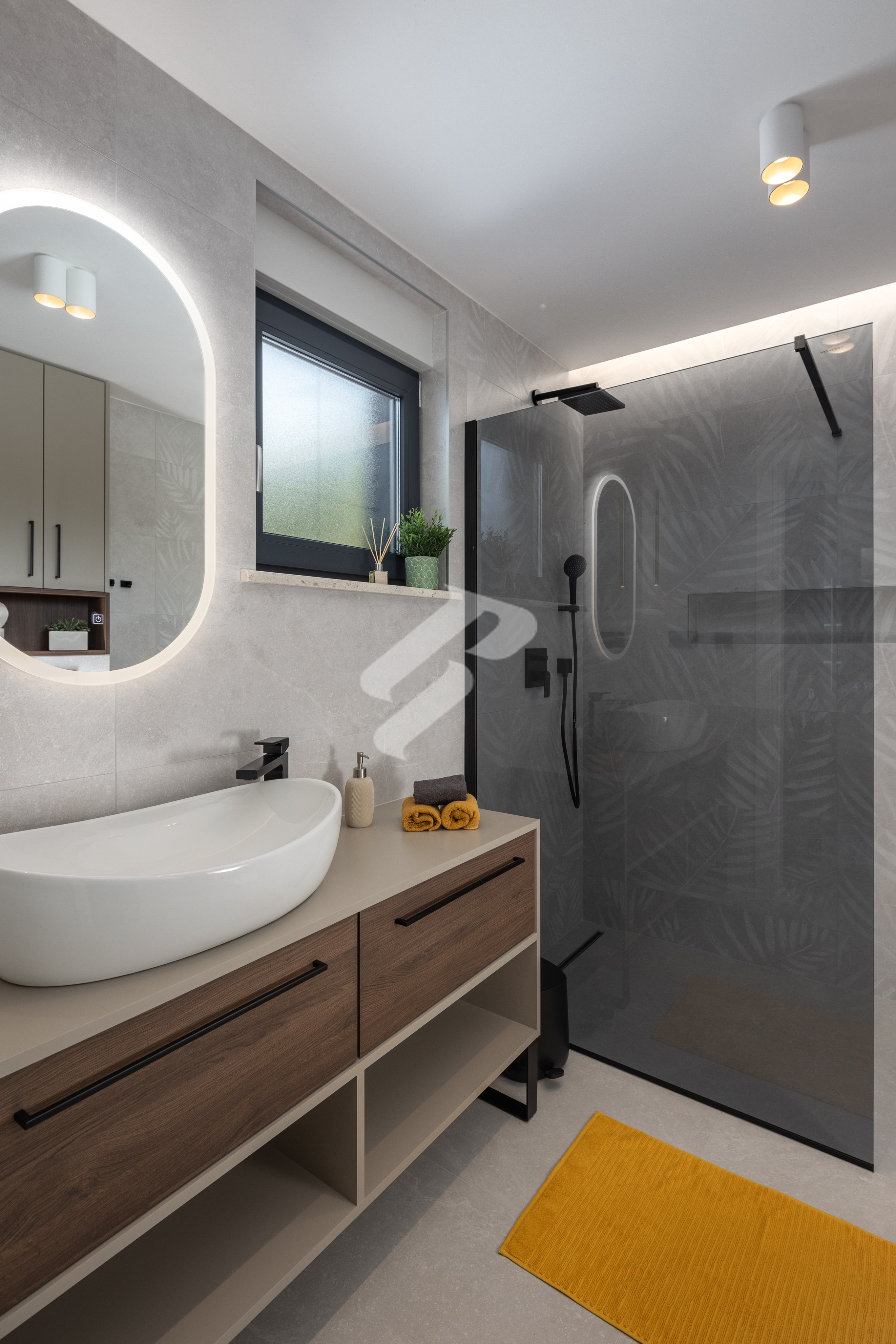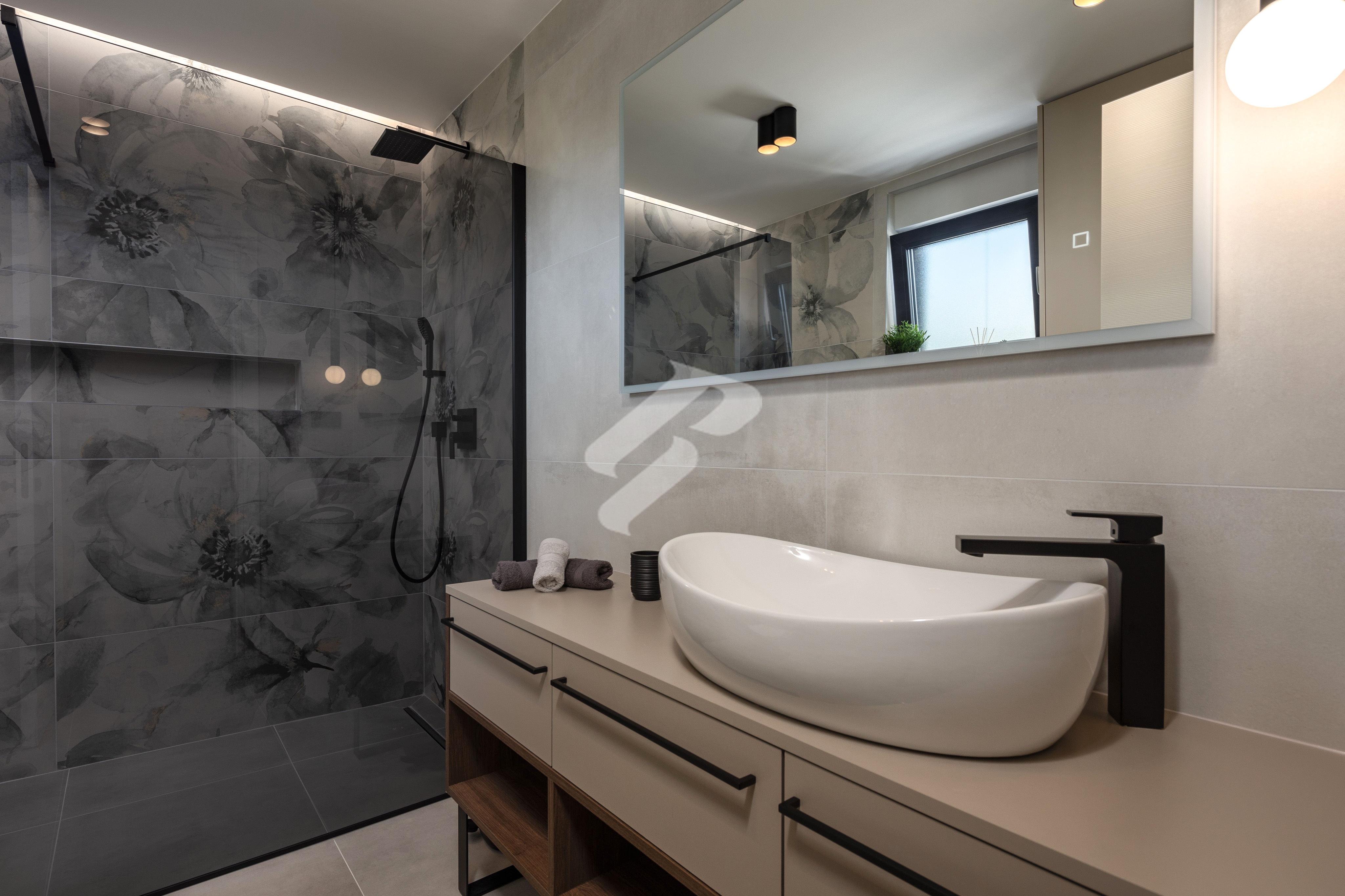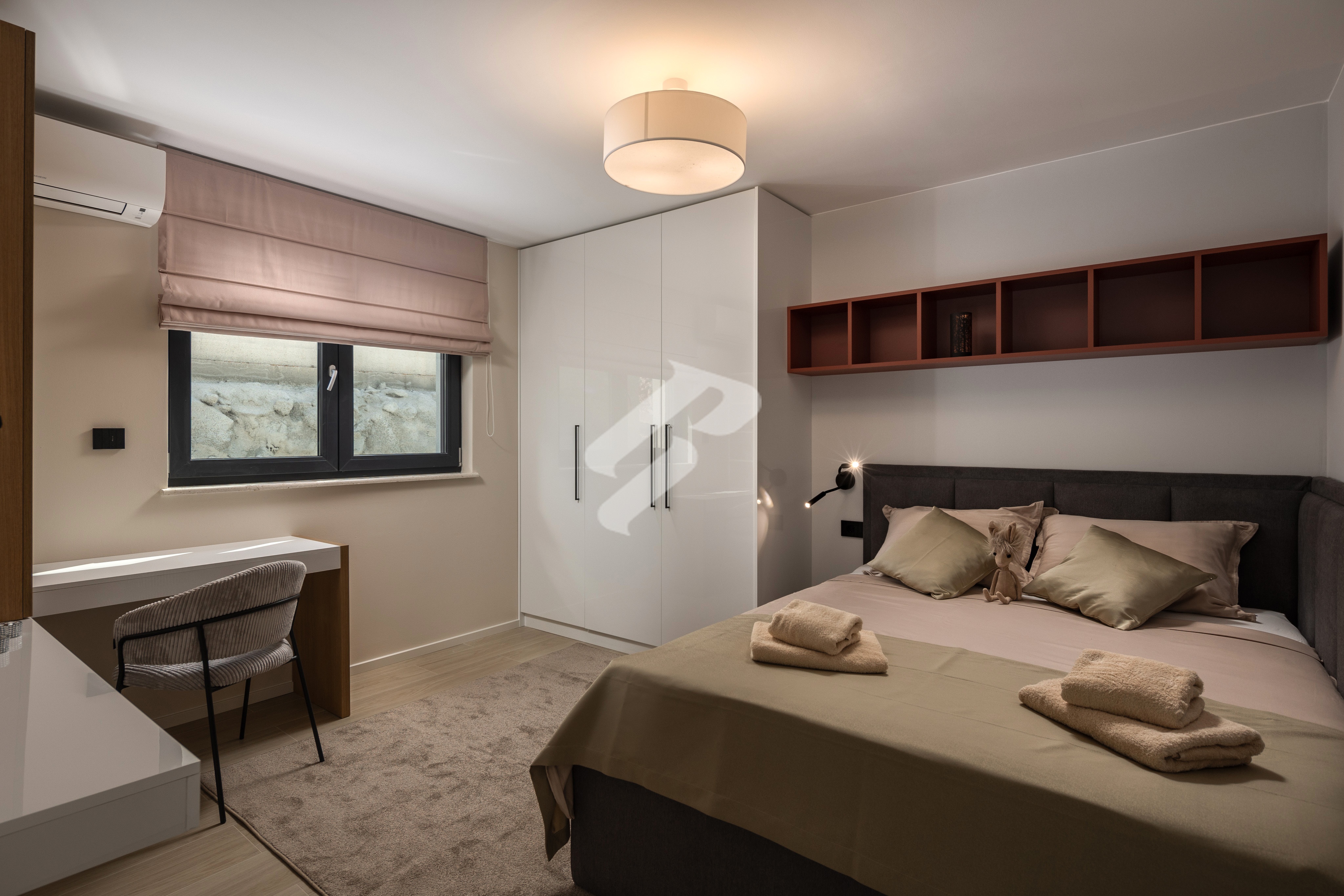 Na prvom katu smještene su tri spavaće sobe, uključujući master suite s luksuznim privatnim kupatilom. Dvije preostale sobe koriste dodatnu kupaonicu smještenu na hodniku, dok prirodna svjetlost i pažljivo odabrani materijali stvaraju osjećaj mira i luksuza.