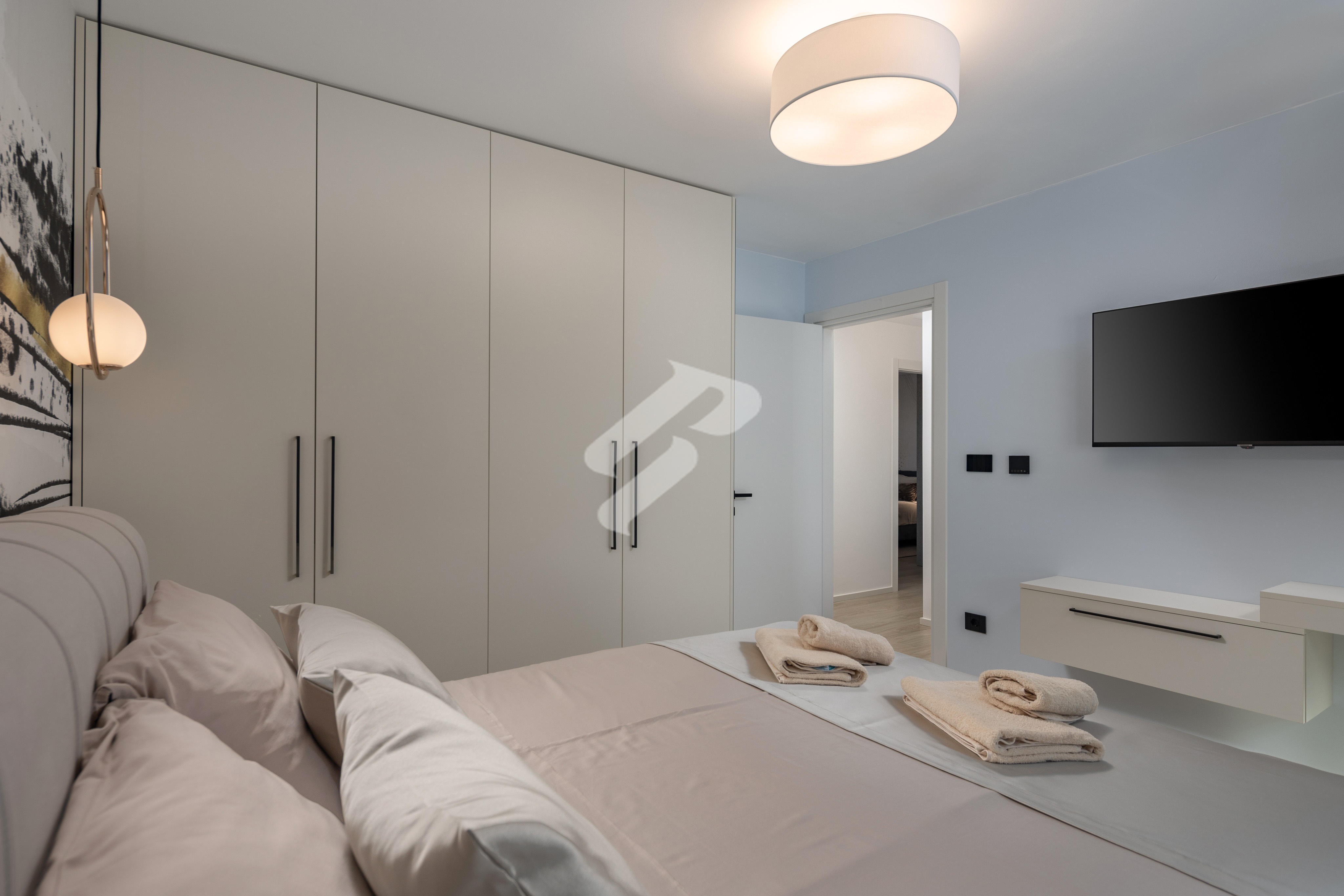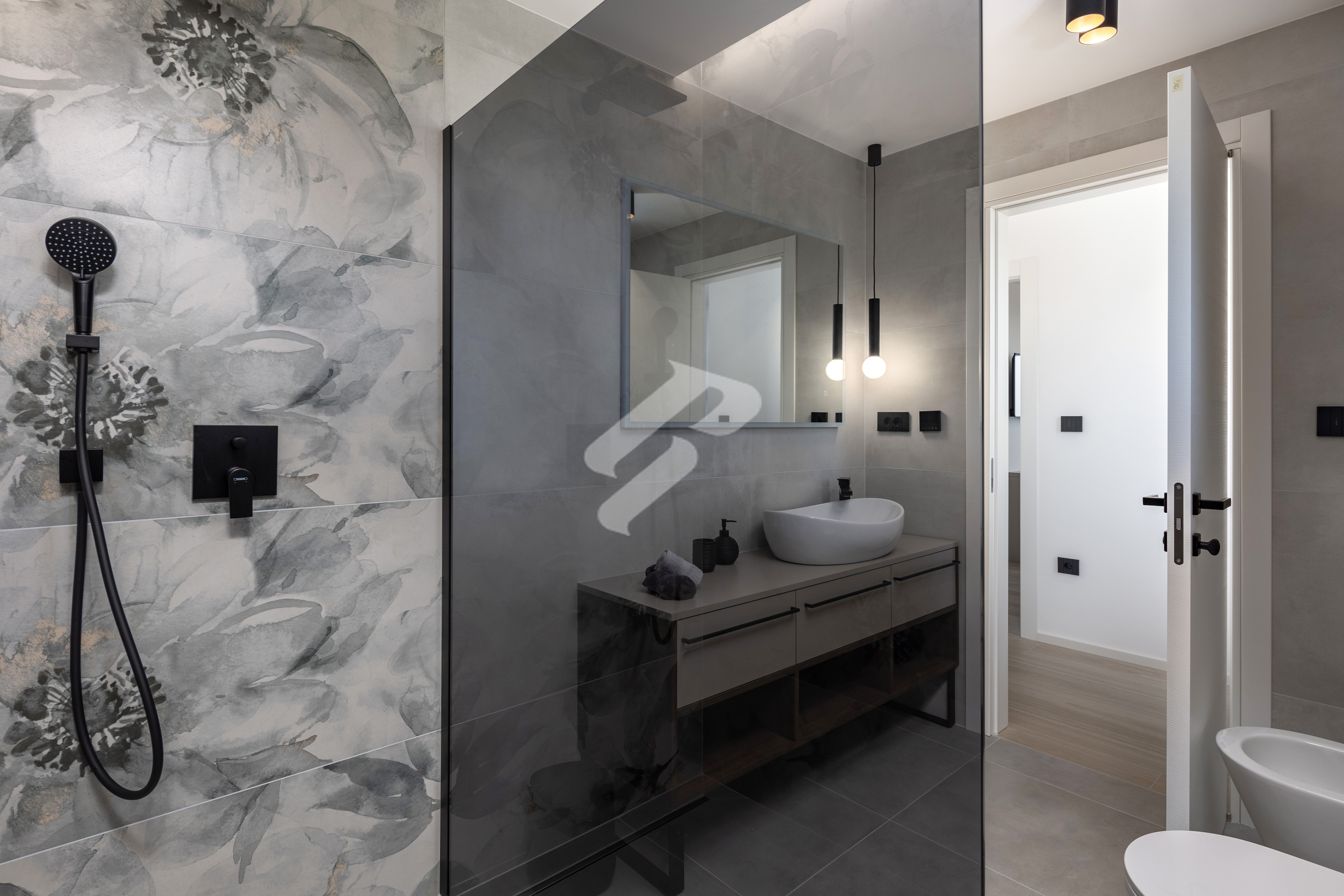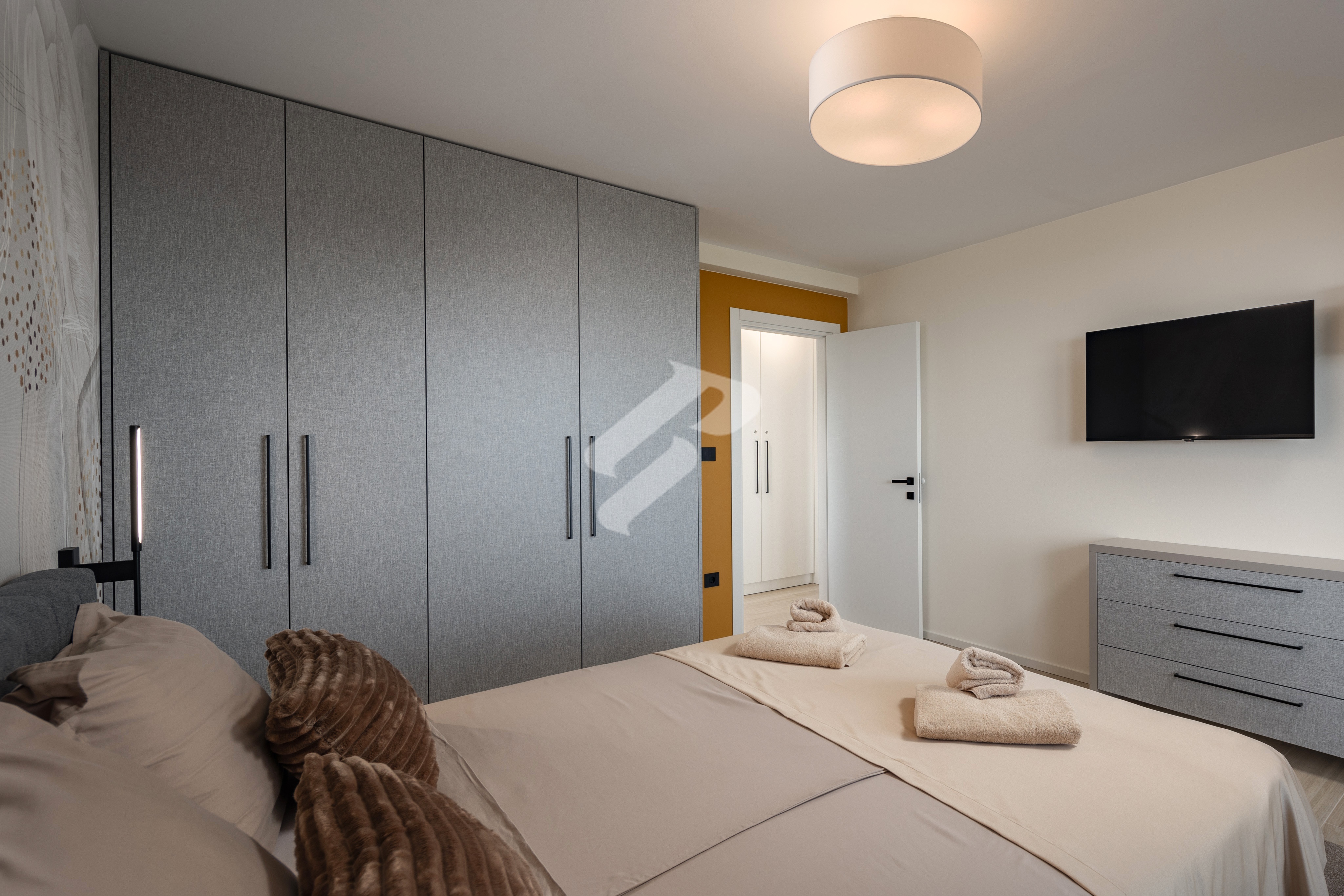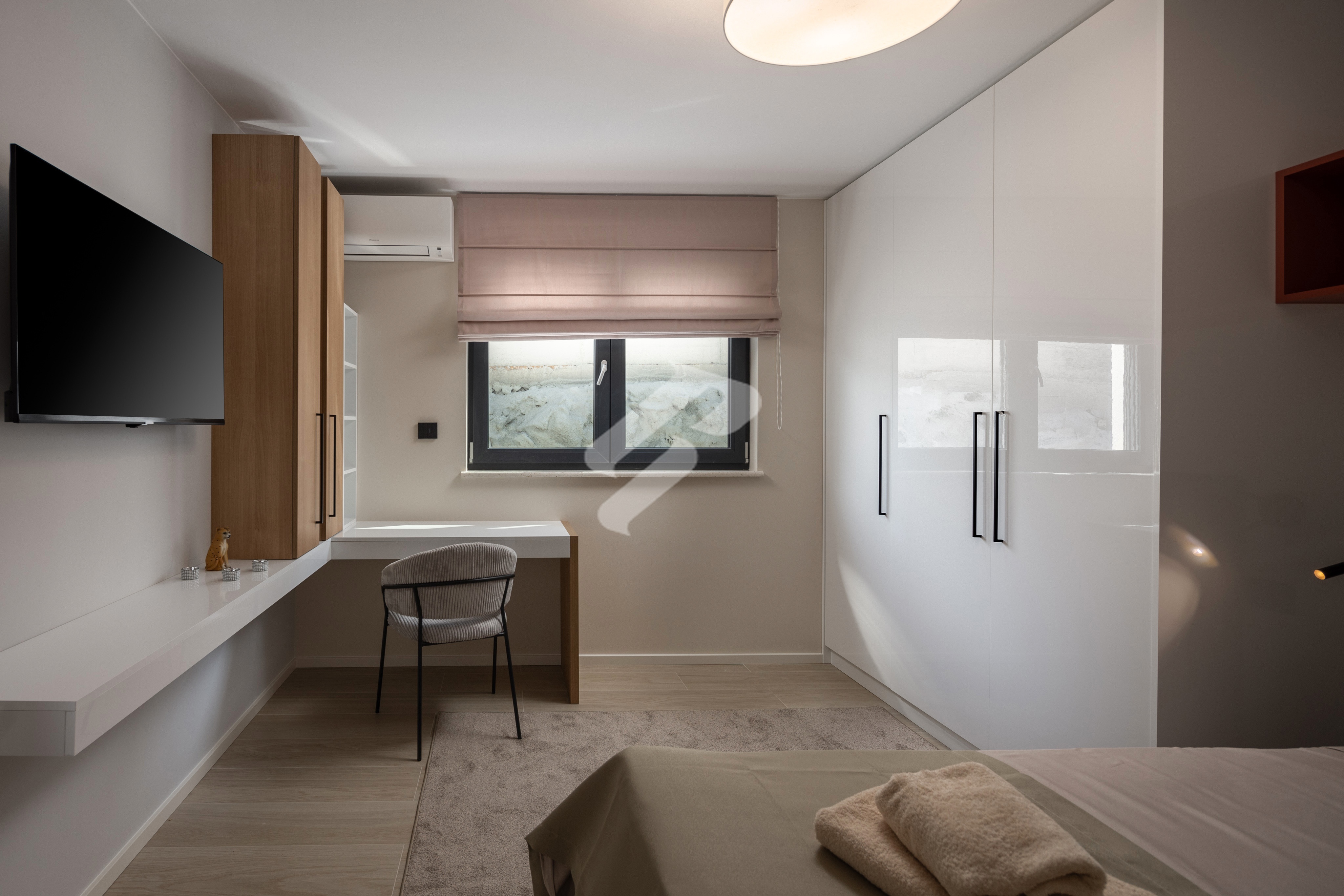Na prvom katu smještene su tri spavaće sobe, uključujući master suite s luksuznim privatnim kupatilom. Dvije preostale sobe koriste dodatnu kupaonicu smještenu na hodniku, dok prirodna svjetlost i pažljivo odabrani materijali stvaraju osjećaj mira i luksuza.