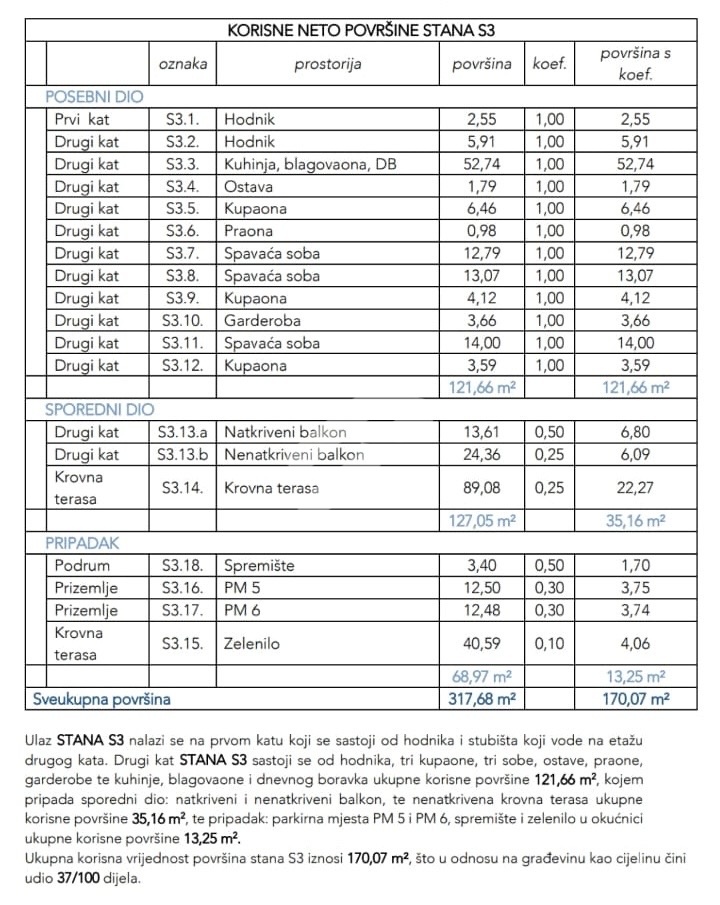 Stan se sastoji od ulaznog hodnika, prostranog dnevnog boravka povezanog s kuhinjom i blagovaonicom, tri spavaće sobe od kojih glavna ima vlastiti walk-in ormar i kupaonicu, te dodatne dvije kupaonice i ostave. Iz dnevnog prostora pruža se izlaz na prostrani balkon, dok unutarnje stepenice vode na krovnu terasu s bazenom, sunčalištem i vanjskom kuhinjom koja omogućuje druženje s obitelji i prijateljima uz prekrasan pogled na more i zelene dijelove grada Krka.