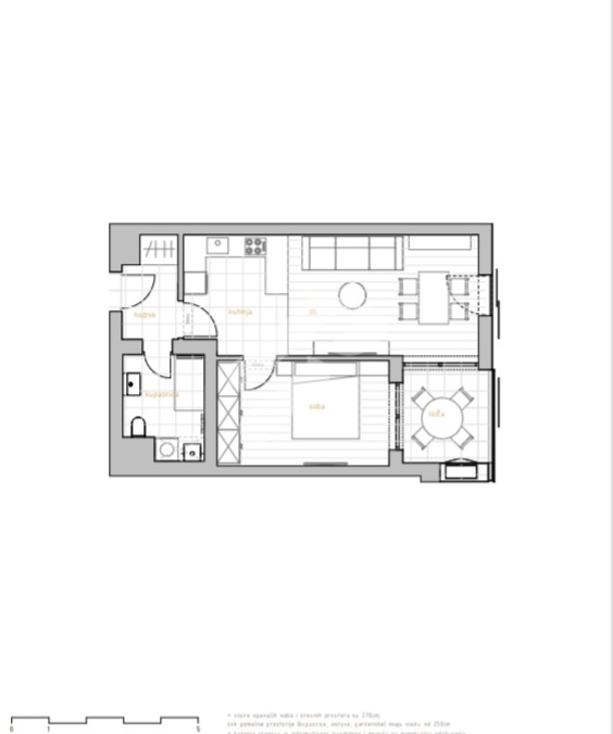 Stan se sastoji od dnevnog boravka povezanog s kuhinjom i blagovaonicom, jedne spavaće sobe, kupaonice i lođe istočne orijentacije koja osigurava obilje prirodne svjetlosti tijekom dana. Stan je nenamješten, što omogućuje kupcu da ga uredi prema vlastitim željama i potrebama.