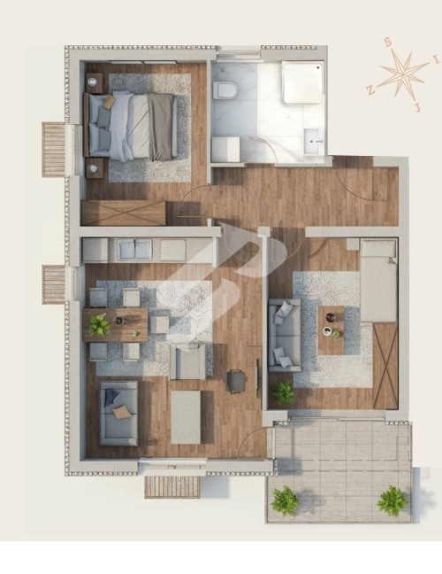 Stan se sastoji od hodnika, kupatila, dvije spavaće sobe, kuhinje s blagavaonicom i dnevnim boravkom, te natkrivene terase koja proširuje životni prostor i omogućuje uživanje na otvorenom u privatnosti vlastitog doma. Moderan raspored i obilje prirodnog svijetla čine ovaj stan izvrsnim odabirom za obiteljski život.